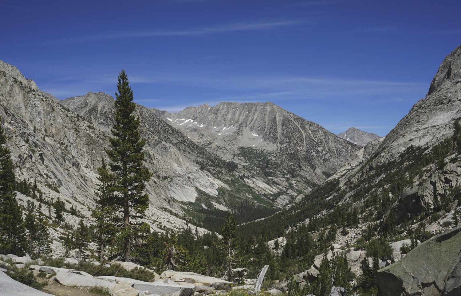 The view down to LeConte Canyon. Another drop from almost 12,000’ down to almost 8,000’ at the confluence of Palisade Creek and the Middle Fork of the Kings River.