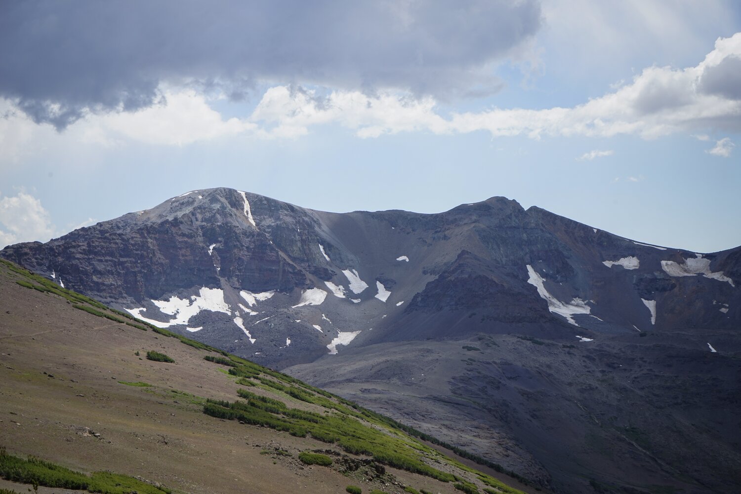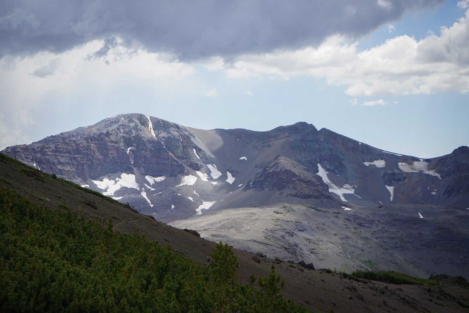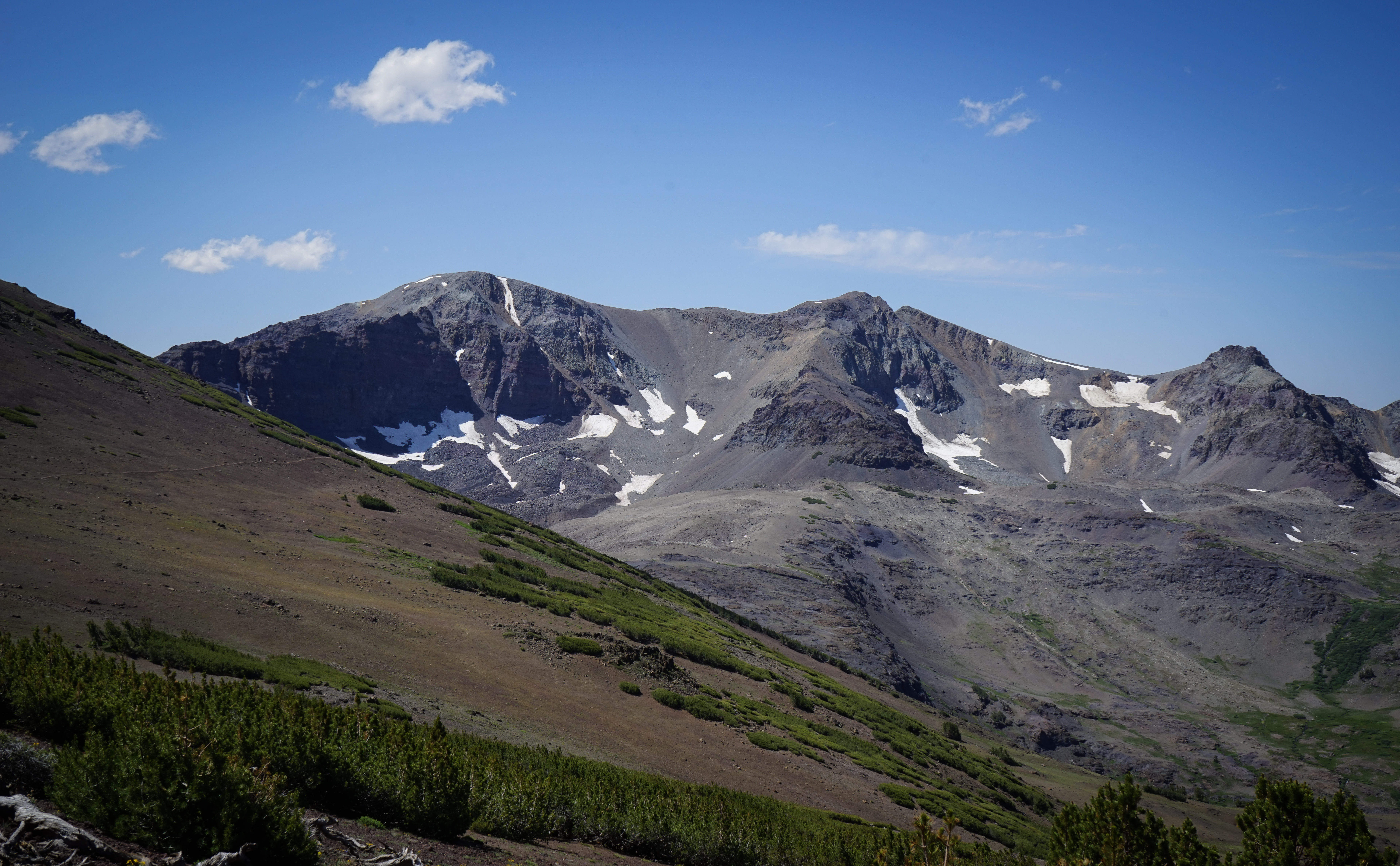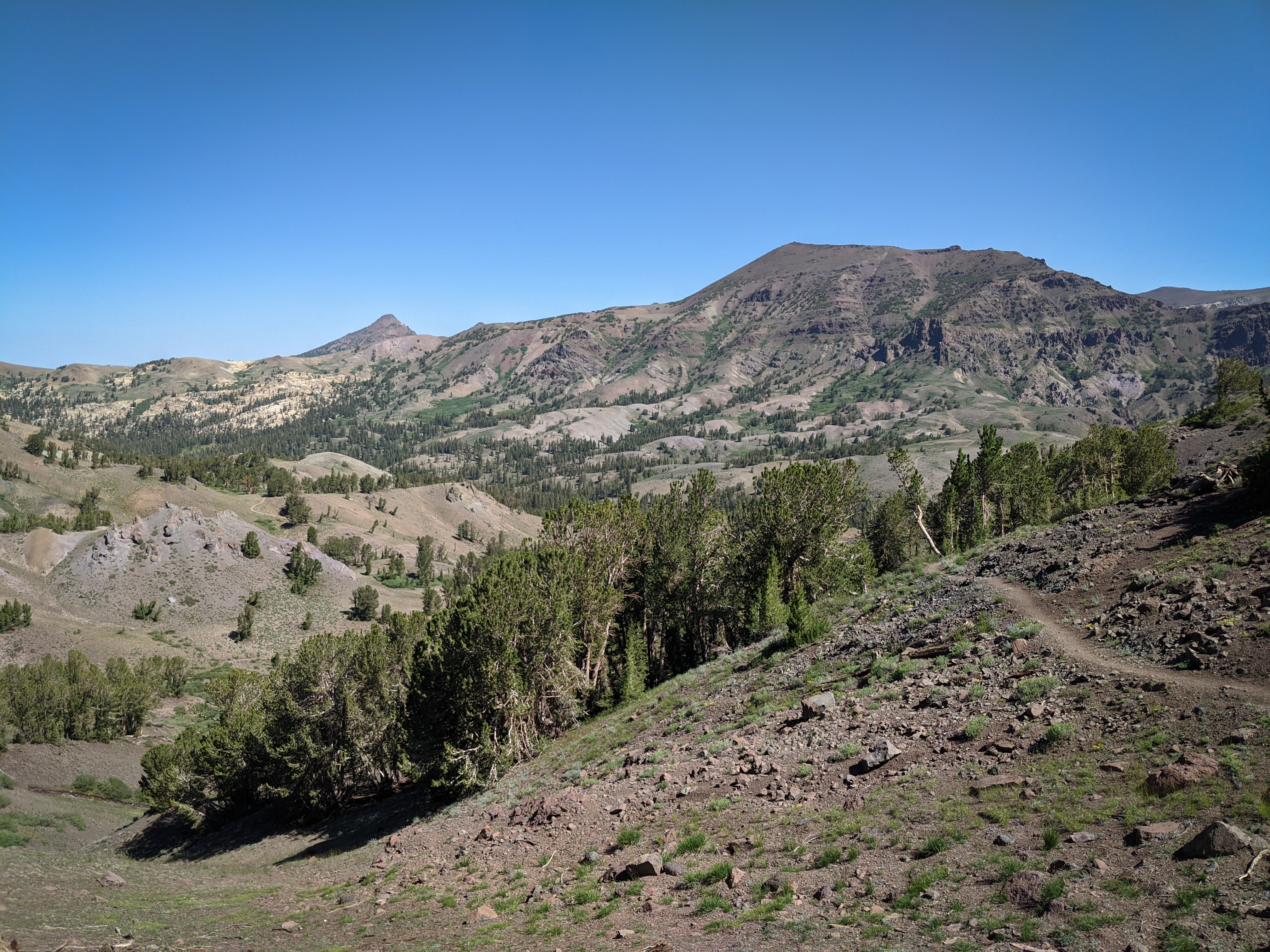 Views of Leavitt Peak from the trail along the crest near the wilderness boundary.