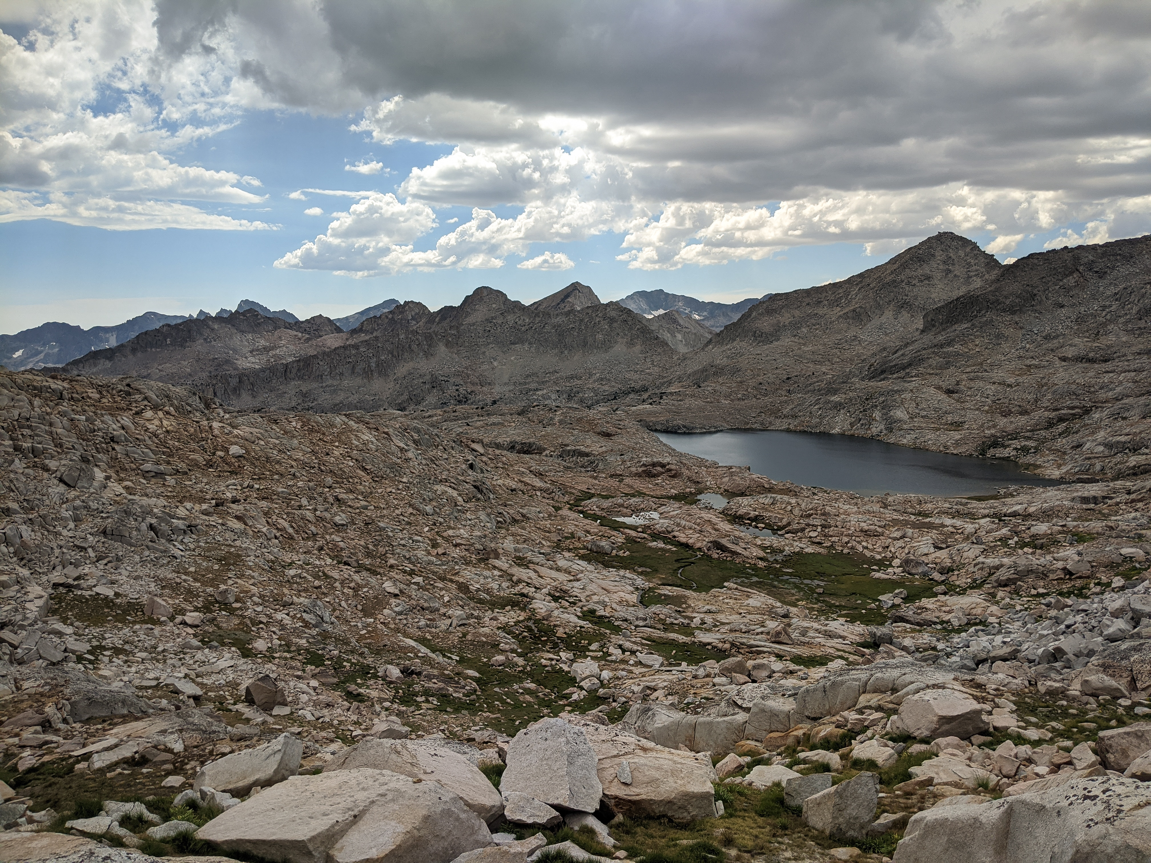 Bishop and Saddlerock Lakes, and even Mount Humphreys, from Bishop Pass. The hike to the pass went by without incident. We saw groups heading up and down. The afternoon thunderstorms the previous day gave some people a bit of excitement.