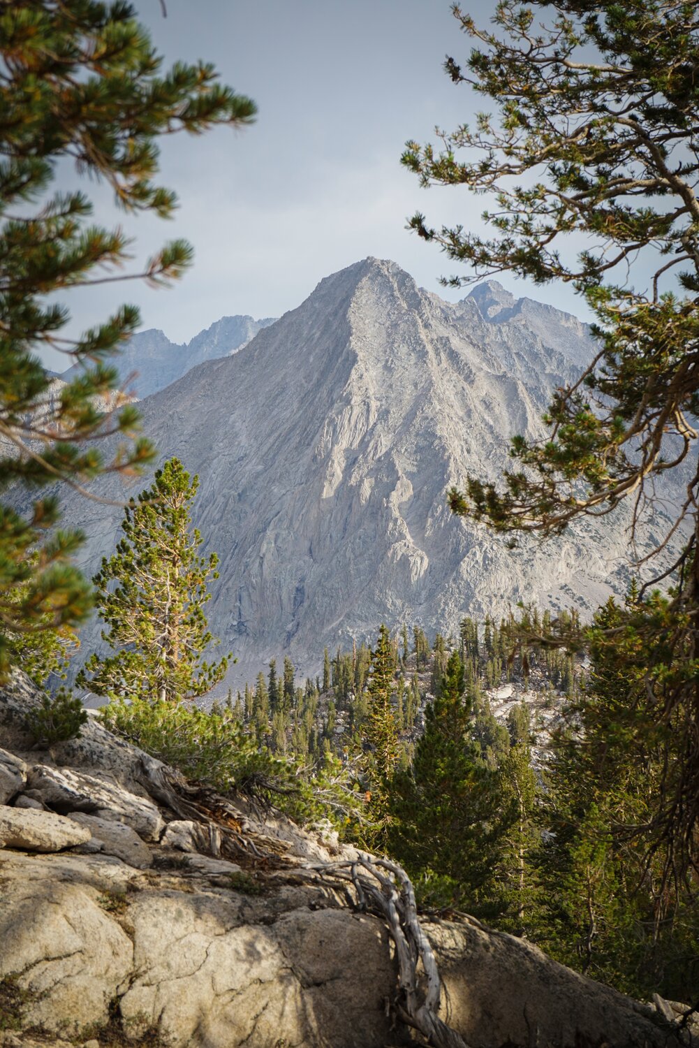 By mid day we reached the Rae Lakes area. Here’s the classic shot of Fin Dome rising above the outlet of Arrowhead Lake, with some of the higher peaks just barely visible in the background.