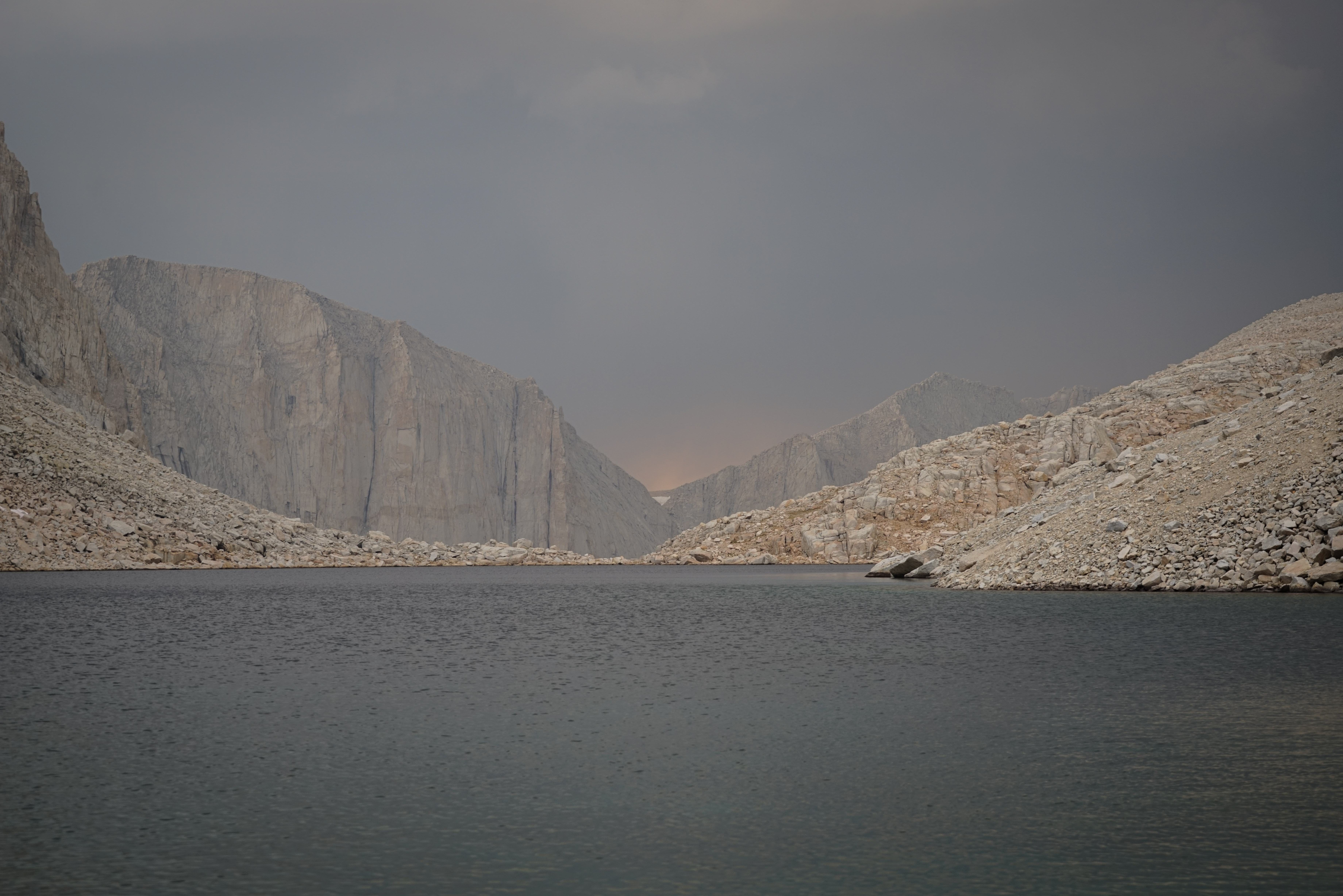 As the sky darkened above us, we noticed an orange glow through the gap between Mount Chamberlain and Crabtree Crags. Given that it was still midday, this was definitely from one of the wildfires. But the location of the glow, which we guessed was near Chagoopa Plateau, didn’t exactly line up with the fires we knew about. Even in retrospect, it’s difficult to determine whether the glow was from a smaller, northern fire like the Shotgun Fire, or the larger Castle Fire (both of these were later renamed the SQF Complex Fire) farther south. But in either case, the glow was close enough to worry us a bit. However, we knew the only hazard in our alpine setting was smoke and made a plan to monitor conditions and hurry out if they deteriorated.