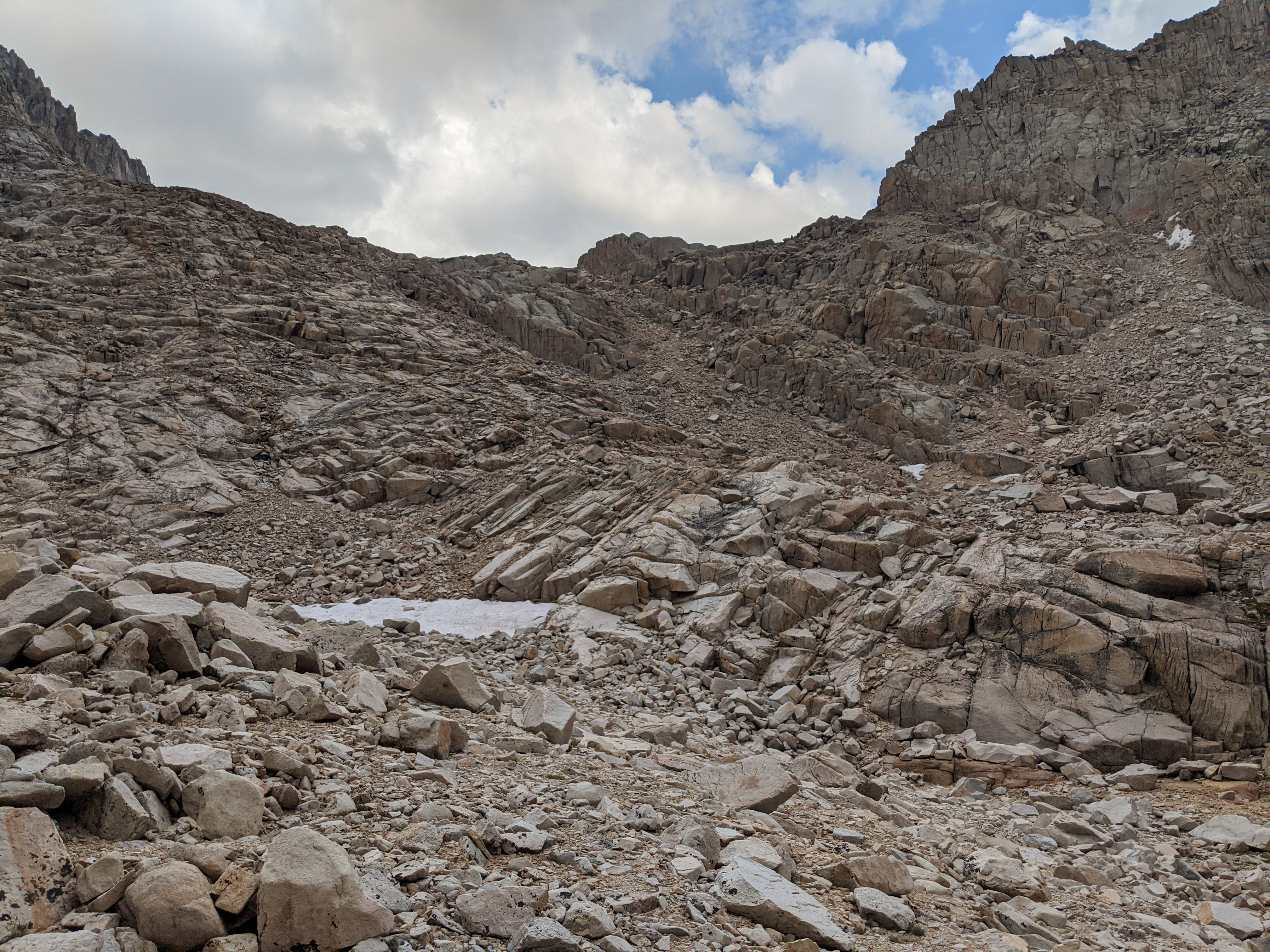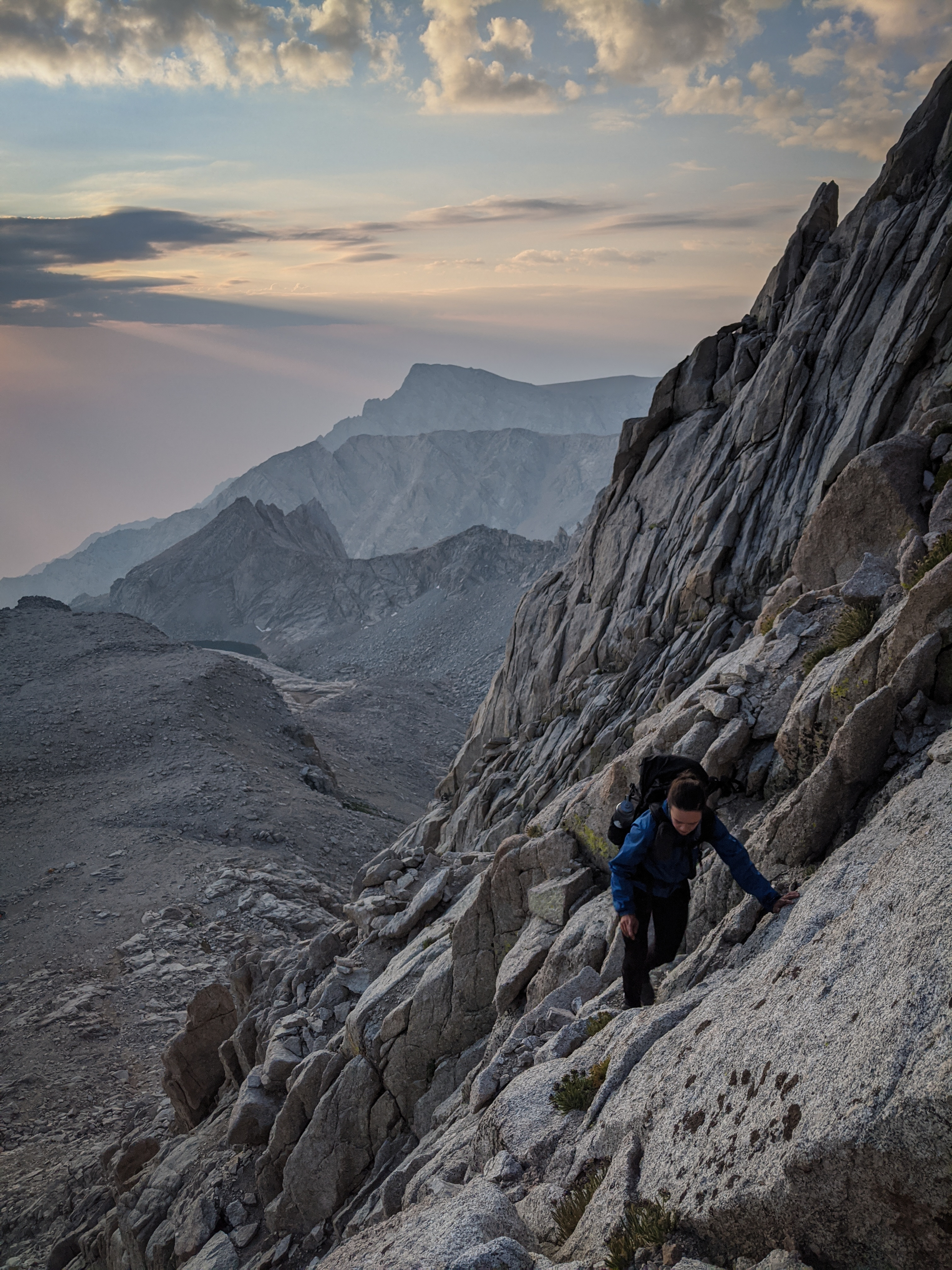 Shannon downclimbing from Mount Whitney. It was almost noon and clouds were building again.