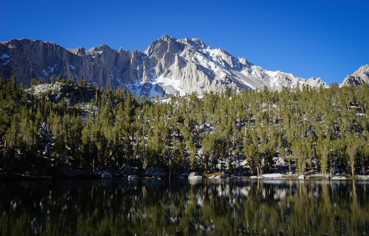 University Peak from Bench Lake. The rib of the North Face cuts diagonally towards the summit, with snowfields on the left side.