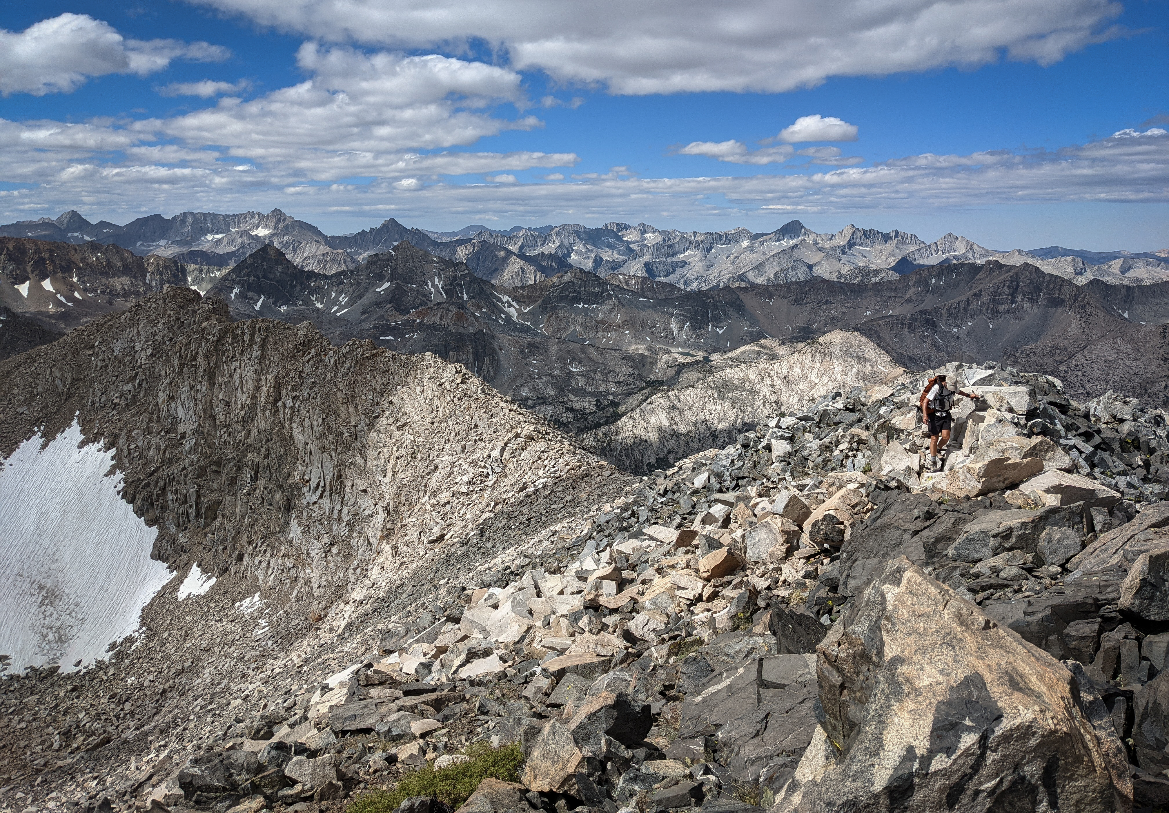 After much struggling, we reached the Sierra Crest by way of some class 3 blocks. Here there was a beautiful sidewalk of talus stretching about a quarter mile to the summit.