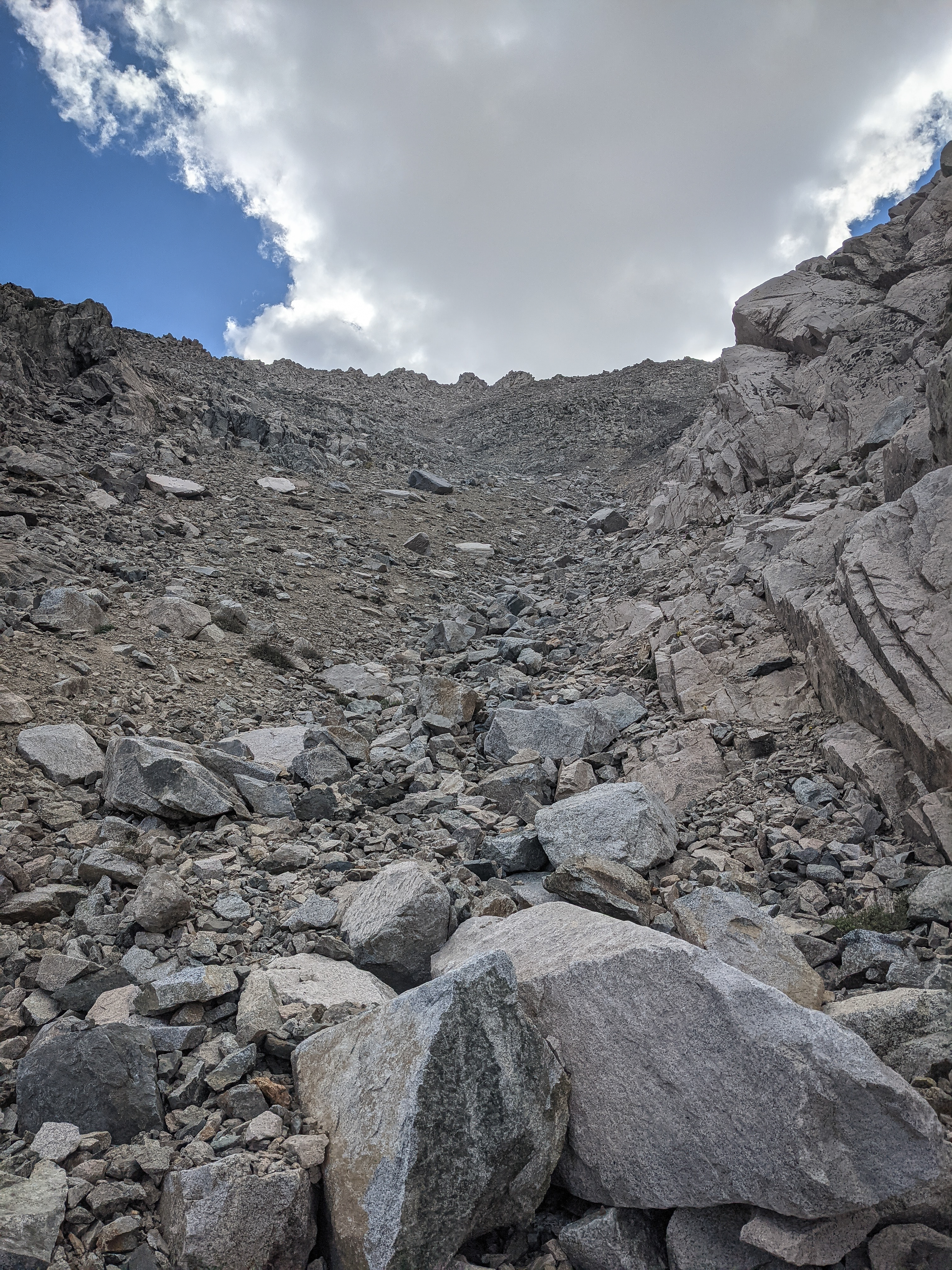 Looking directly up the 2,000’ gully. We started climbing up, hopping over boulders and climbing sand. It was quite loose and while it wasn’t steep enough to be very dangerous, the looseness coupled with the high altitude made for tough climbing. I stuck to the more solid rock outcroppings where possible, which helped a bit.