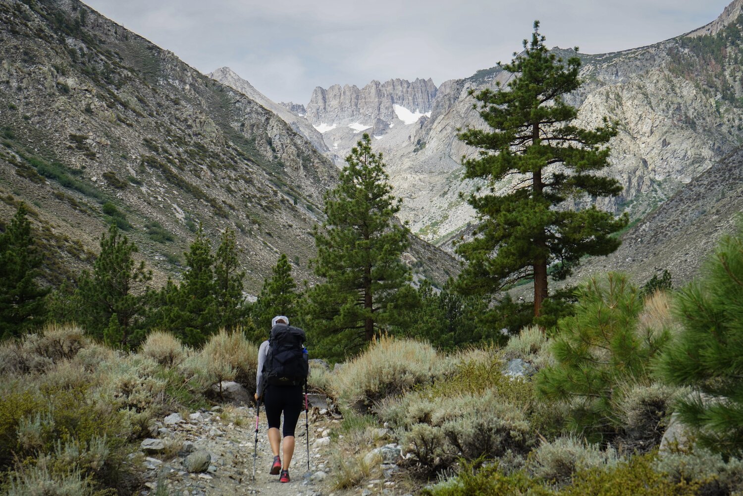 Shannon hiking along the trail with Palisade Crest high above. The first mile or so of this trail parallels the road before veering off up the North Fork.