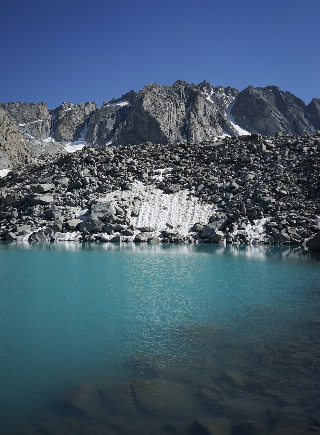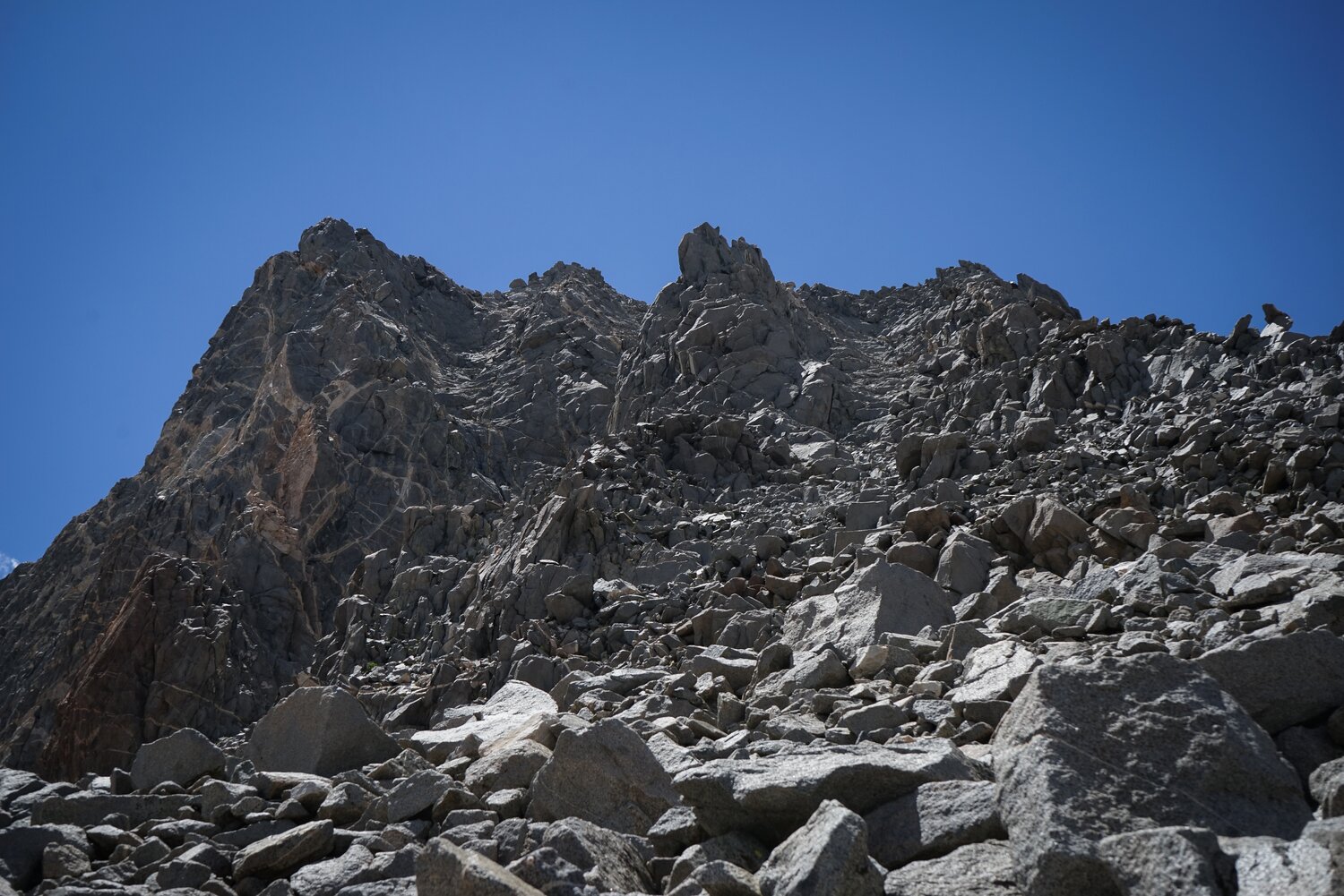 Above the small lake, we climbed about 50 vertical feet up onto the massive moraine of the Palisade Glacier and continued making very slow progress towards Mount Winchell. I initially wanted to cut off a little bit sooner, aiming for what I thought was the East Arete and the white rocks, but Shannon pointed out that Secor had said to wrap around closer to the Thunderbolt Glacier. She was right and so we continued rock hopping upwards.