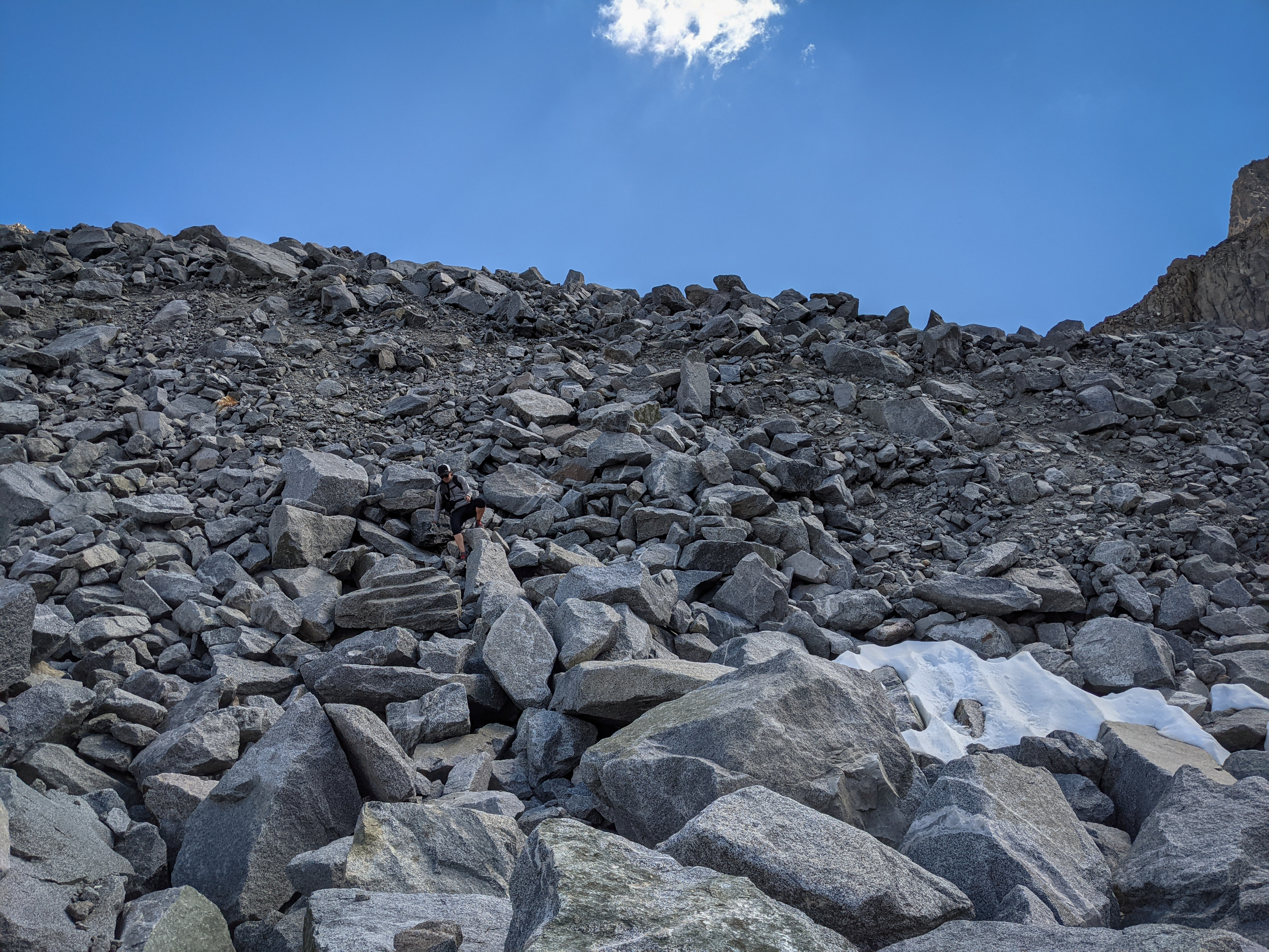 It was almost 11 by the time we reached the base of the correct route, which we confirmed because we saw the other hiker coming down. Between the altitude and the vast sea of large talus, we were not moving particularly fast today. Fortunately, the weather was holding.
