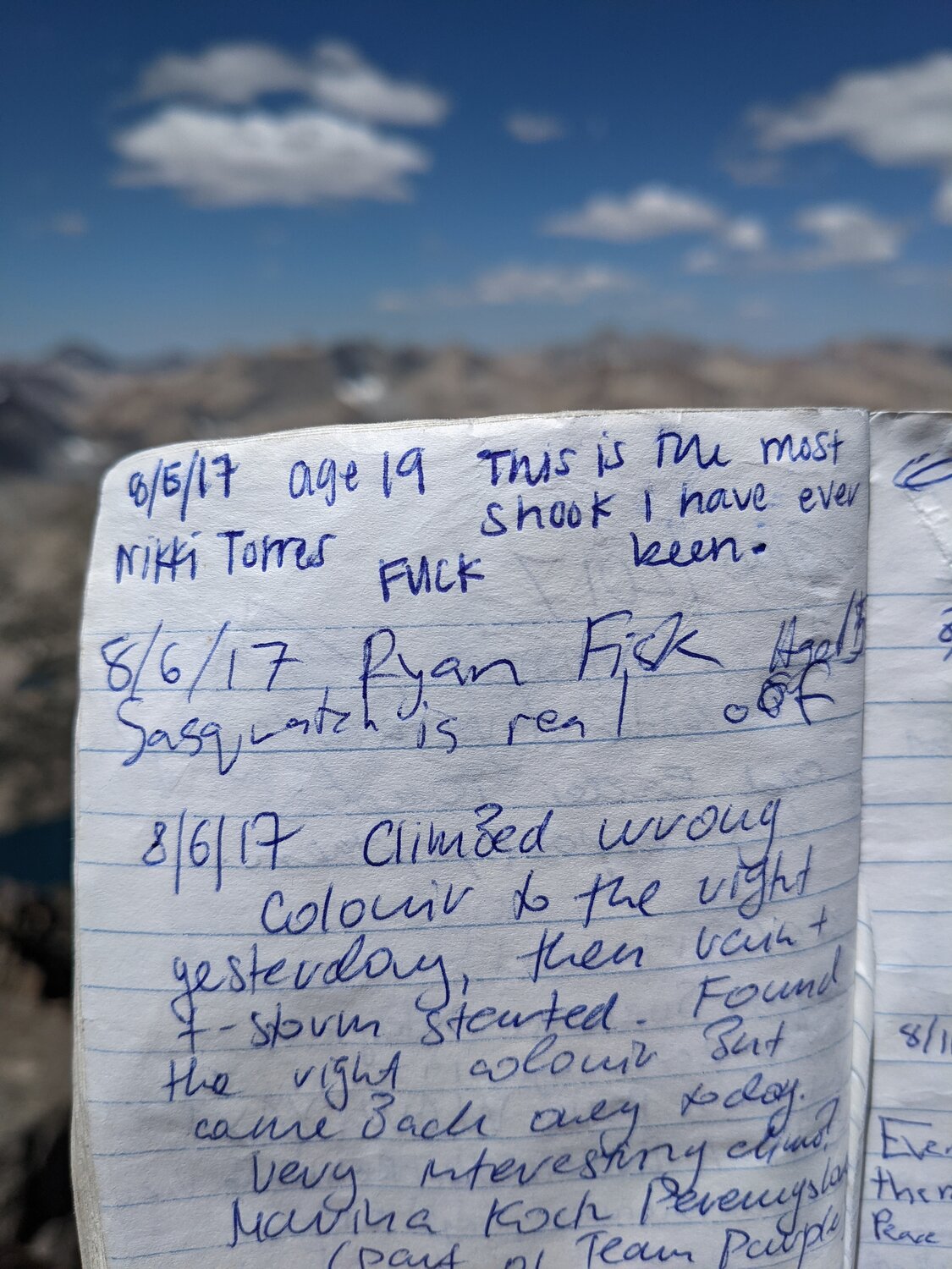 I thumbed through the summit register before signing it. It seemed this peak is quite popular, perhaps owing to a combination of its easy access, easy climbing, and impressive-sounding name. There were several entries about “ripping clouds” on top of Cloudripper.