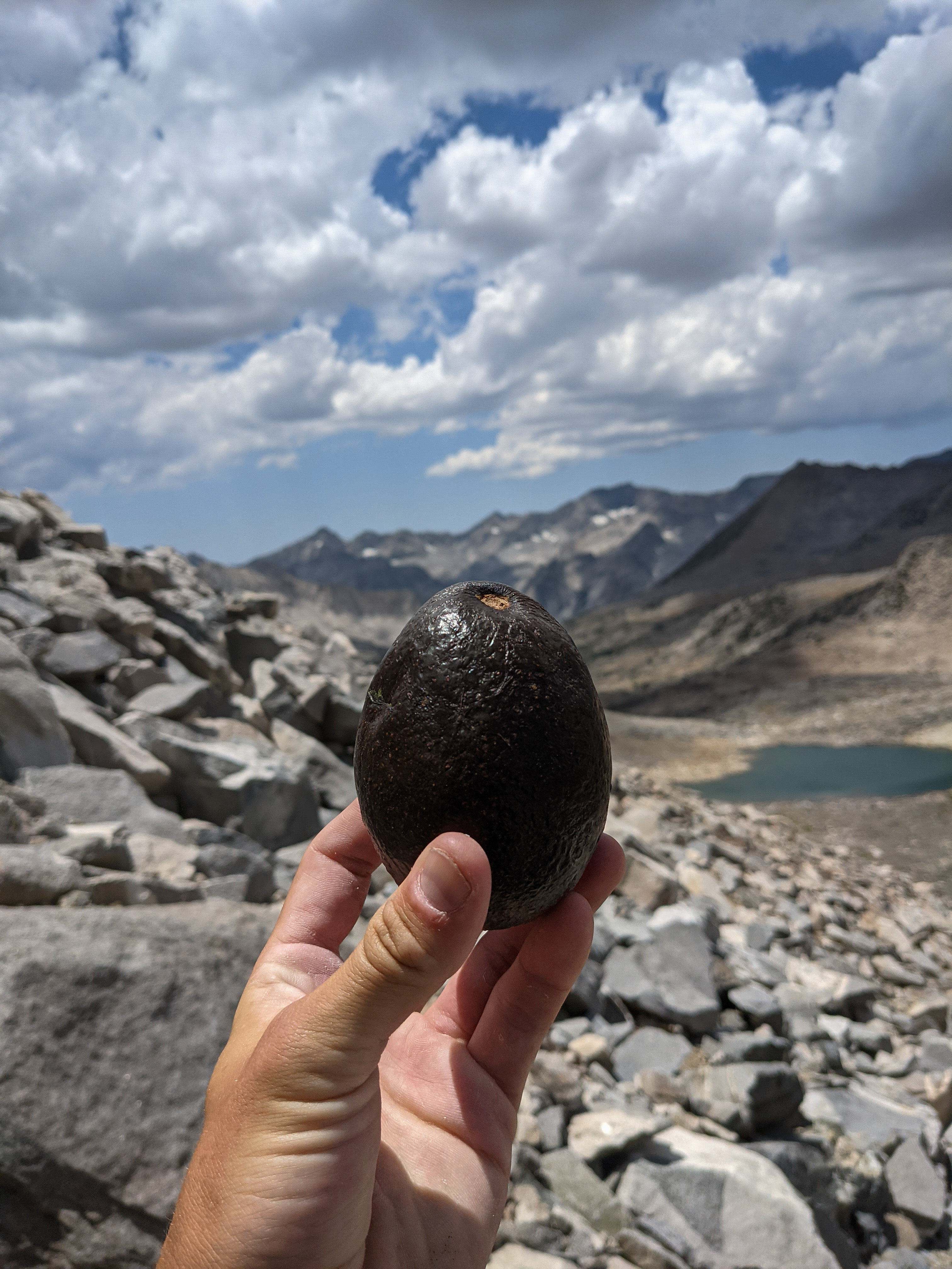 After picking our way down much class 2 and passing several of the groups ahead of us we were most of the way back down to Bishop Pass and we came across… an avocado! Knowing that avocados are not native here, we dutifully packed it out.