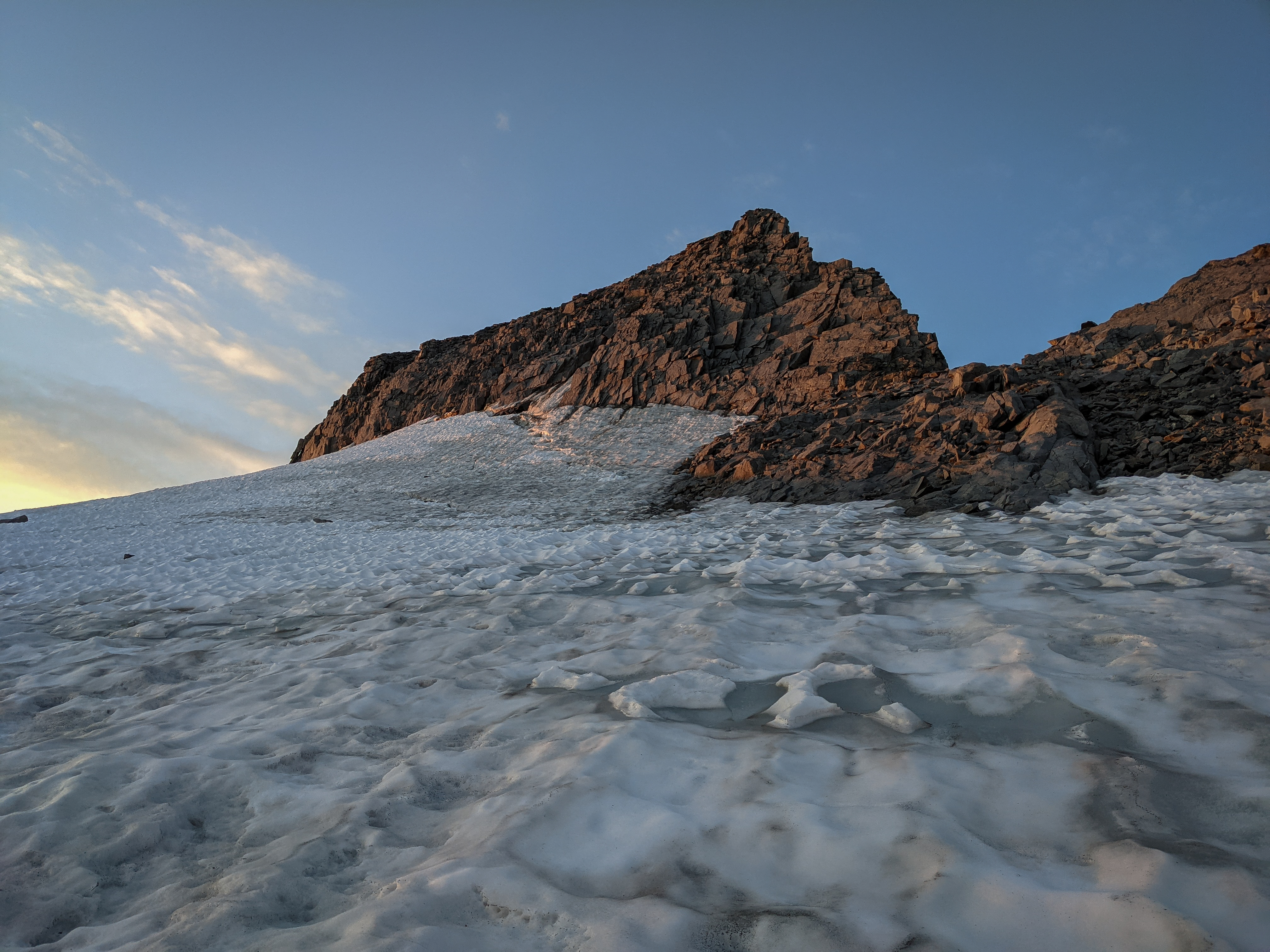 The routefinding was not easy in the dark. Fortunately it was very easy travel over large slabs and if we just went up we were mostly heading in the right direction. We zigged and zagged up towards the glacier, looking for the easiest routes that we could see in the limited light. Eventually we made it to about 11,800’ where the easy climbing transitioned to talus and we began hopping from rock to rock in the predawn light.