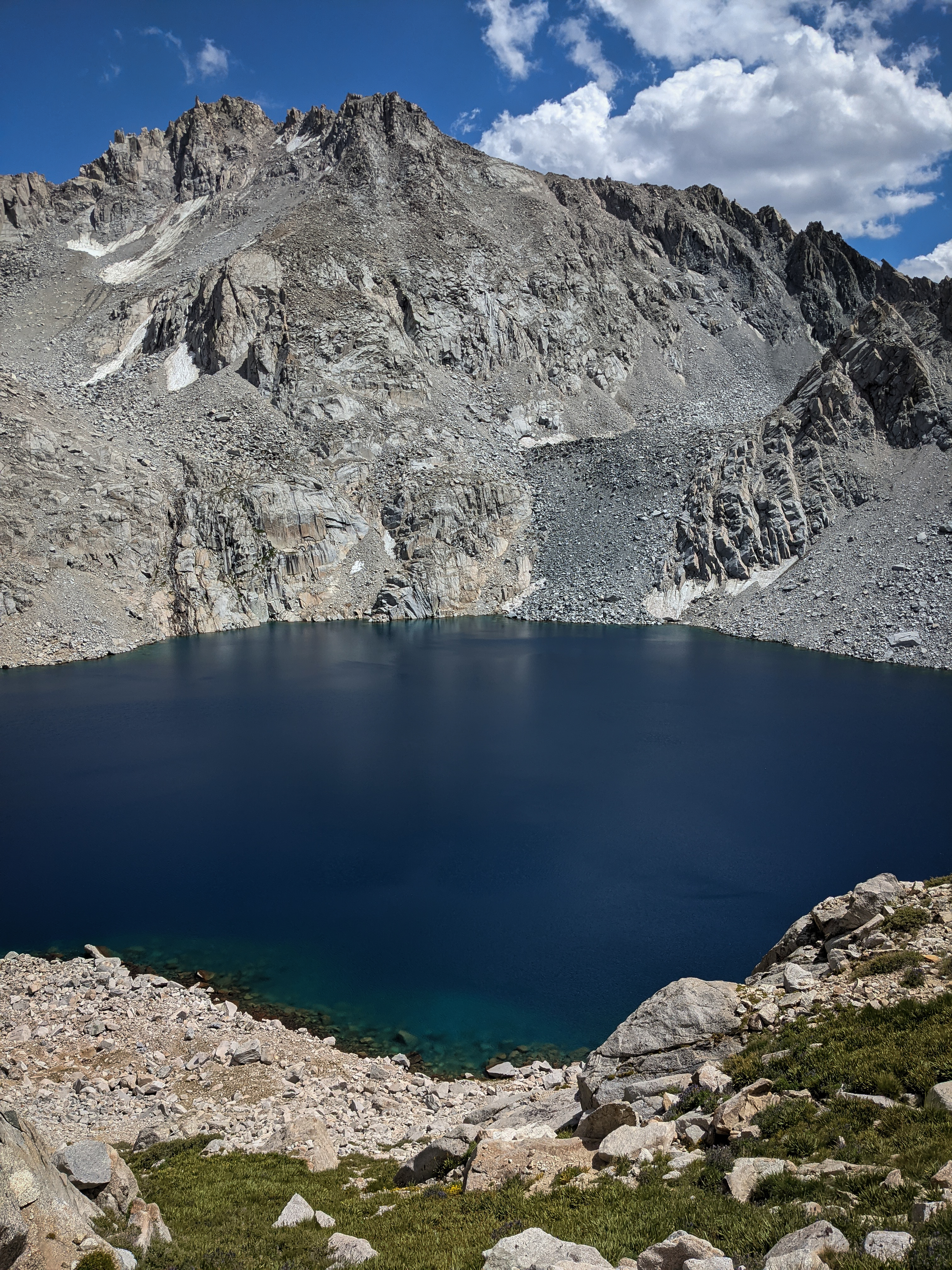 There were a bunch of entries from folks doing the Evolution Traverse, a lot more than I expected. I added my name to this little piece of history before setting off back down. I climbed down the slightly more direct Southeast Slope route, which required traversing south off of the peak and finding a suitable chute for descending. The rock on this part of the mountain was awful, which may explain why the next peak to the south is called “Crumbly Spire.” I took care to pick the least steep chute to descend, but I was knocking down small avalanches of rocks with each step. The steep upper 400’ of the descent was quite an adventure and very slow. But soon enough I reached the less steep section around 12,500’and it was just loose and not-so-steep. I sped up a bit and reached the small tarn above Echo Lake before rejoining the path I had taken up through the talus and hiked down to Echo Lake.