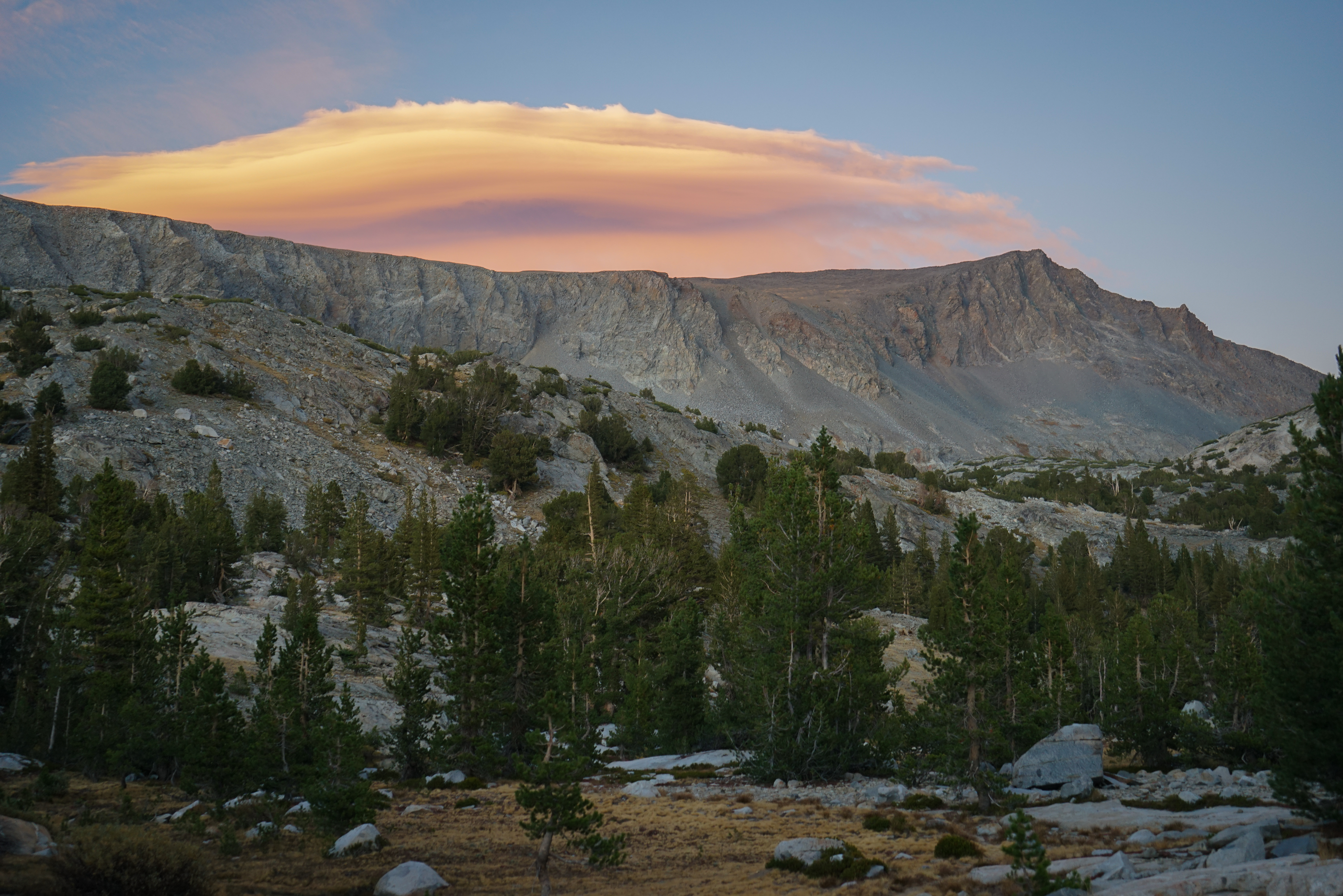 There was an impressive sunset that colored the lenticular clouds that had formed over the mountains. We hurried to set up camp, cook dinner, and filter water as the temperature started to drop, before turning in for the night wearing all of the warm clothes we had.