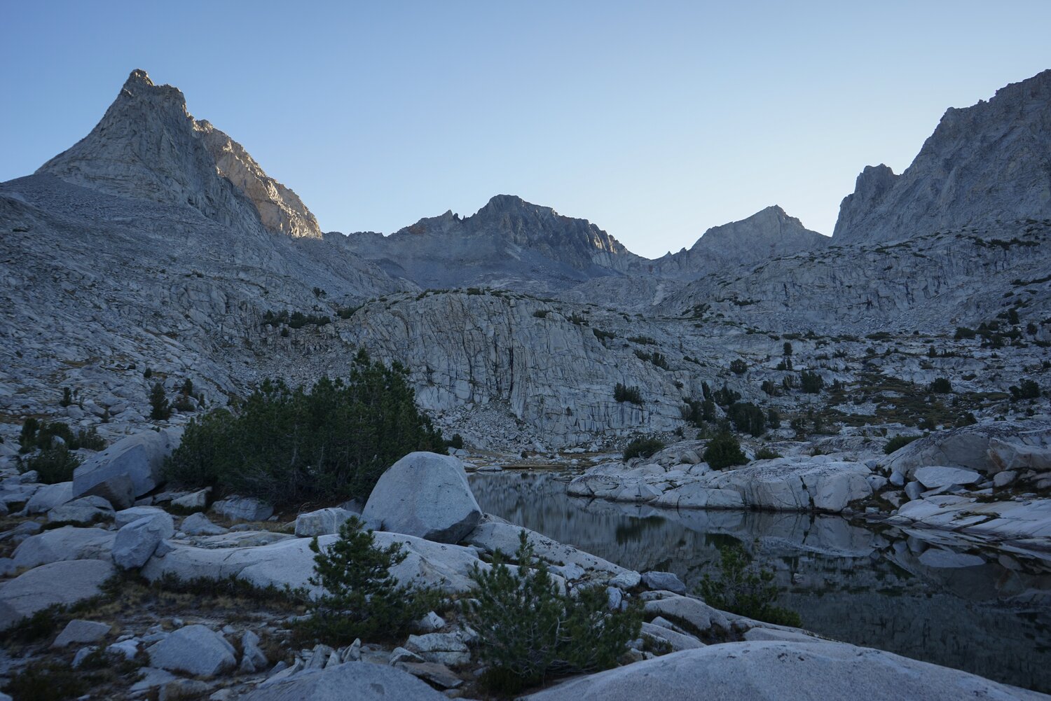The last evening light on Mount Ansel Adams. We planned to take a zero day the next day to climb nearby Electra Peak, which we had some trouble picking out on the ridgeline above us due to its somewhat low prominence. We figured it must still be on the SPS list for some reason anyways. With fewer preparations for the weather, we tucked into bed and enjoyed a podcast before sleeping.