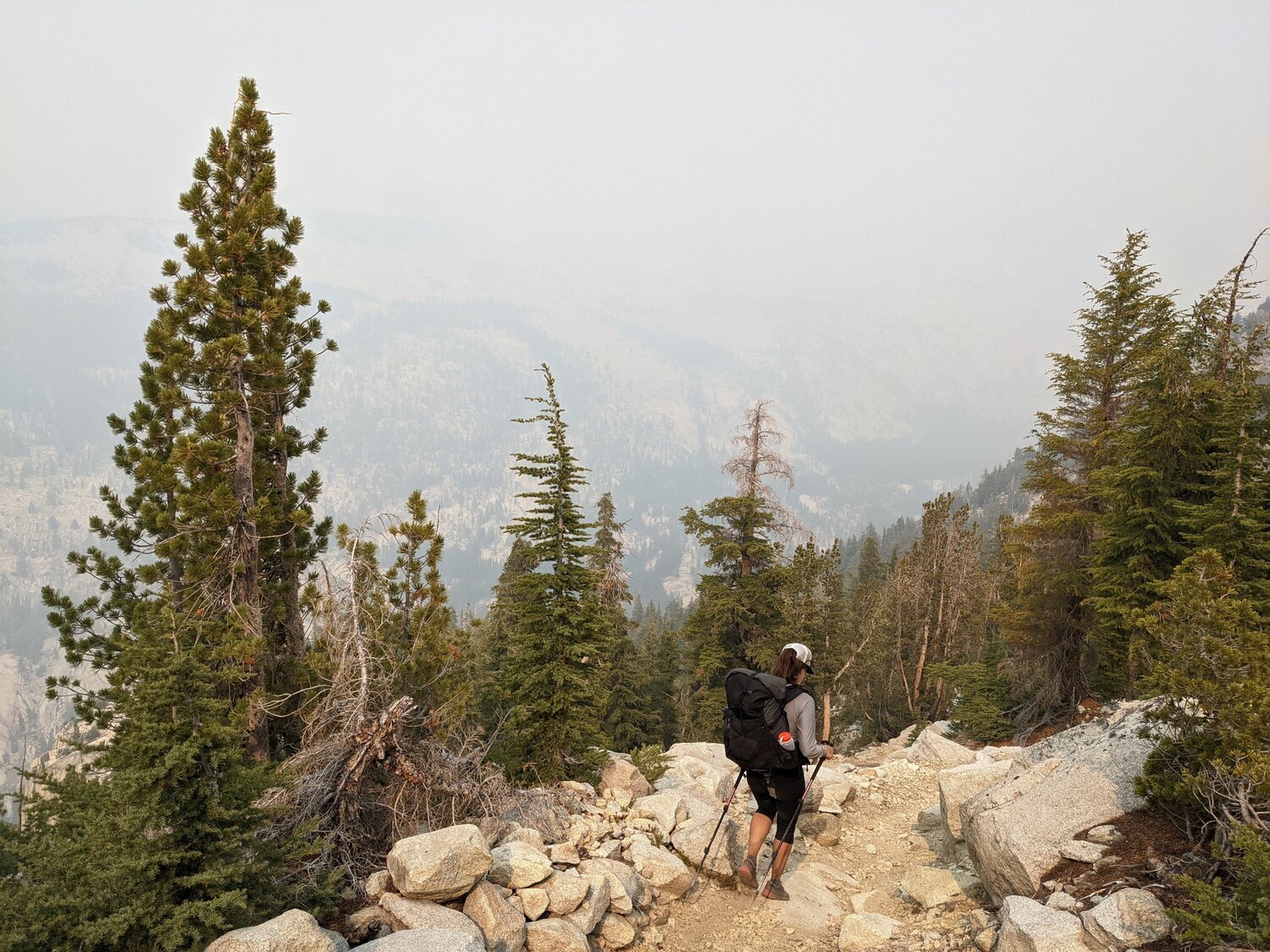 Looking back south from near the crossing of the Lyell Fork. The Isberg Pass Trail traverses a bench high above the Merced and would have some impressive views to the west along much of its length. Unfortunately, we couldn’t see much through the smoke, so we just put our heads down and hiked.