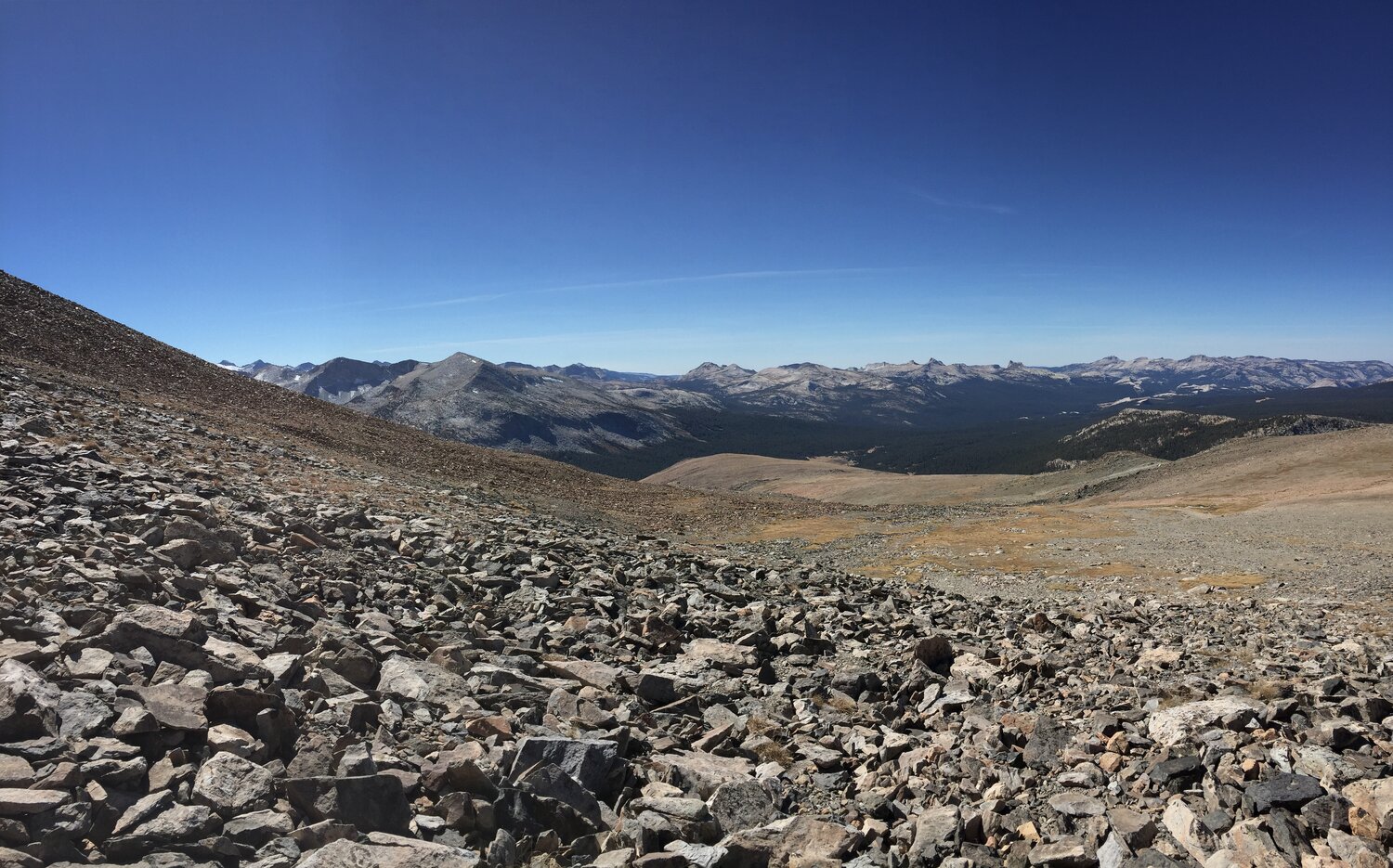A panorama shot of the Cathedral Range on the way down.