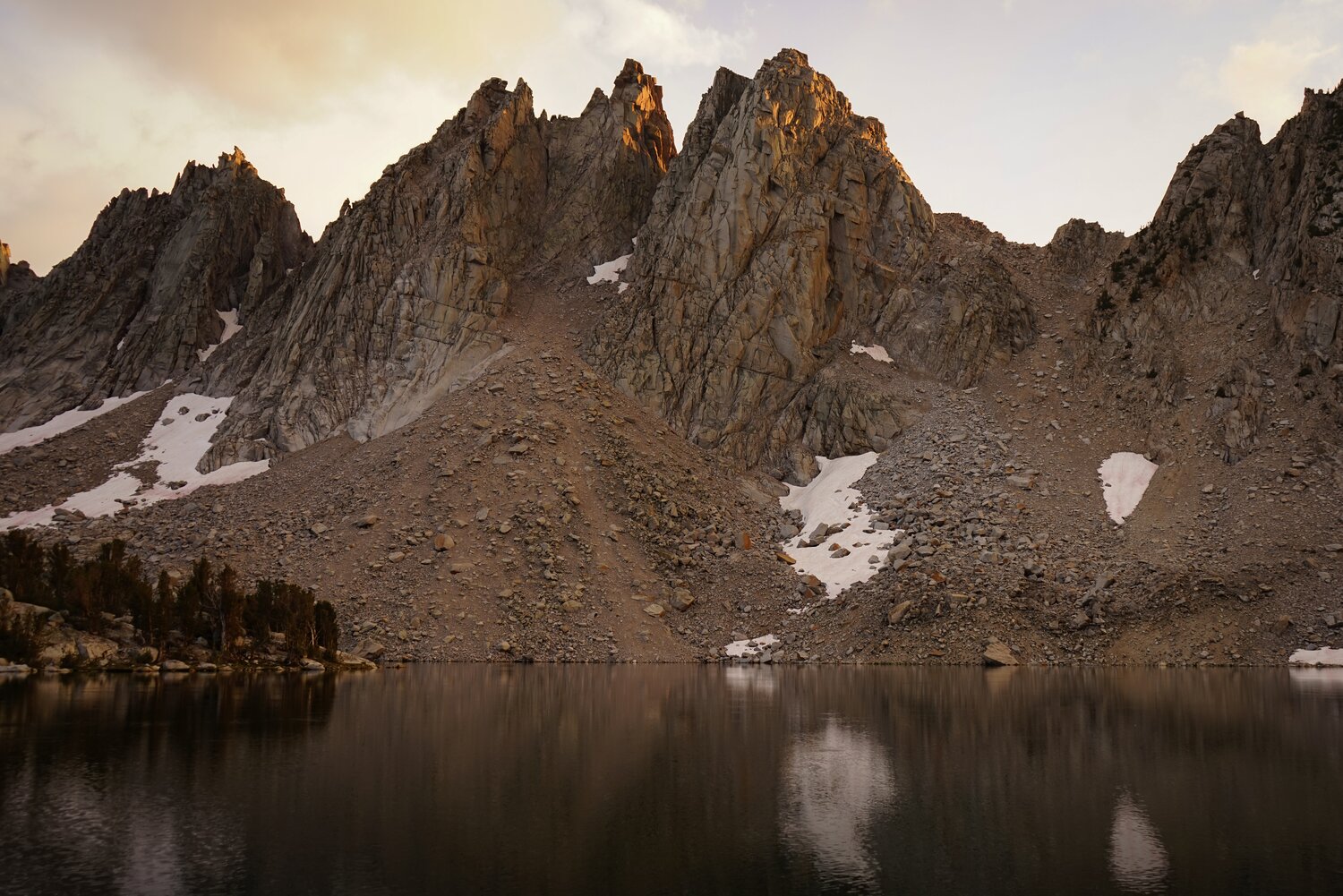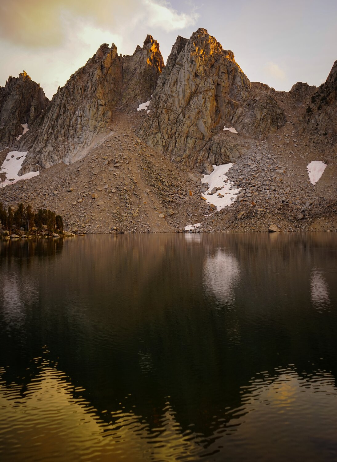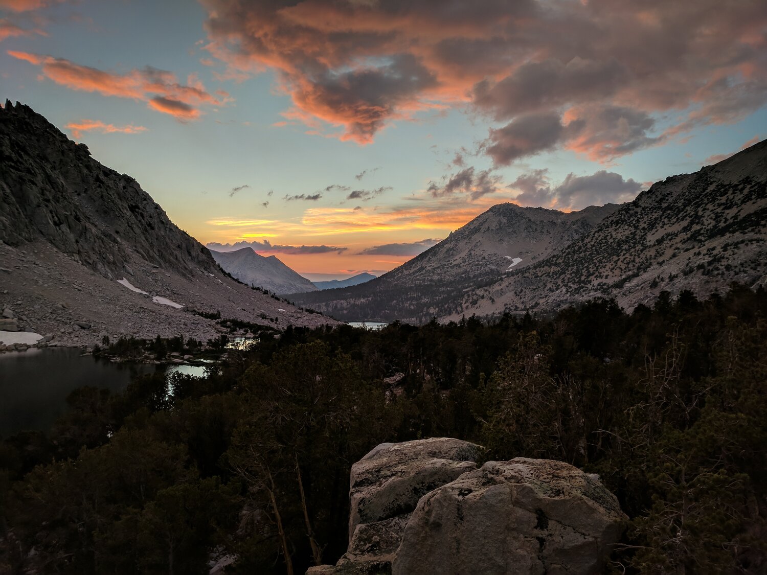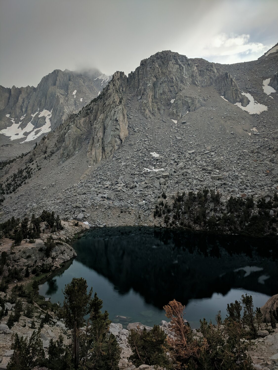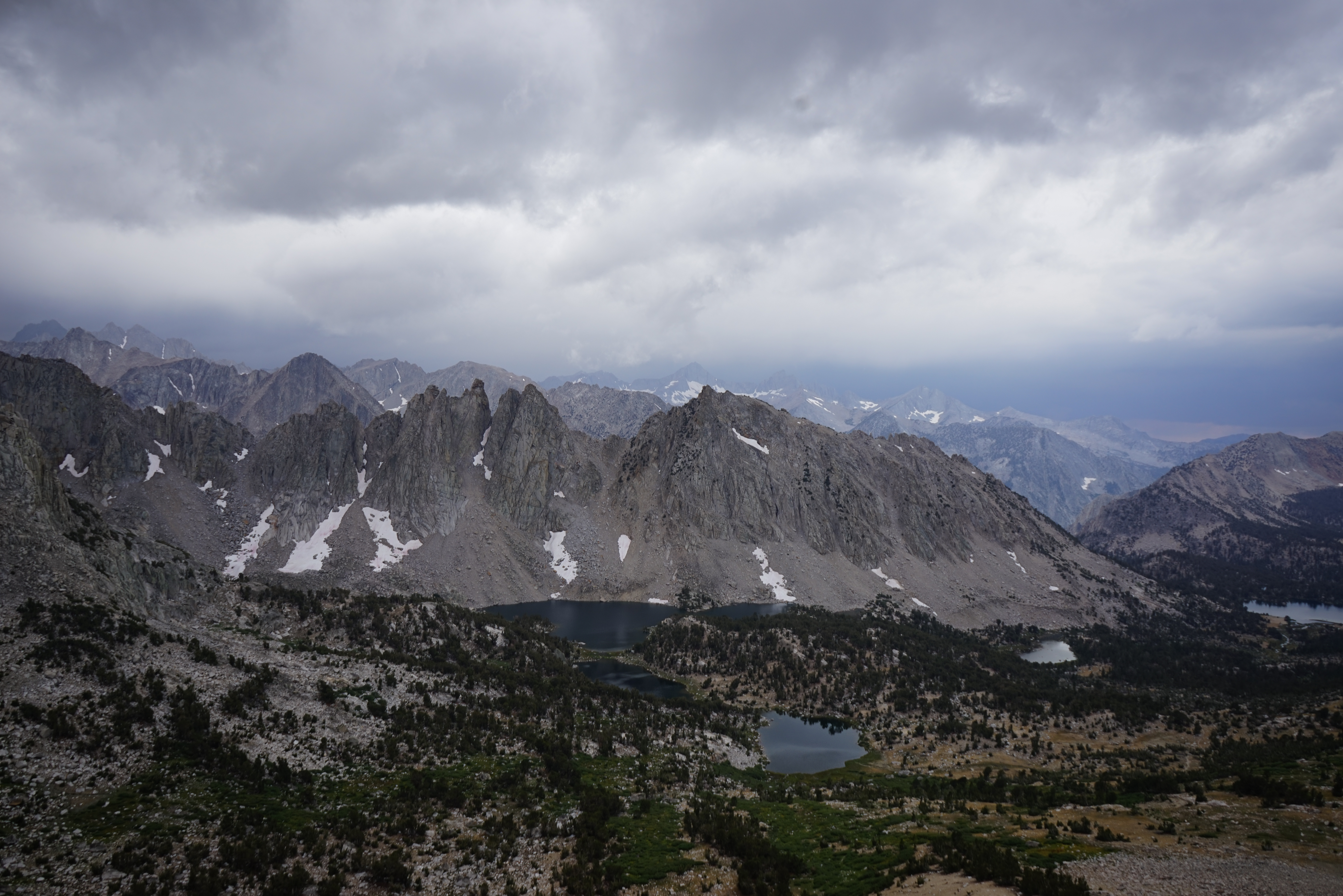 The storm looked a little bit more active to the west. We made our way down from the pass and found a campsite in the trees near one of the Kearsarge Lakes.