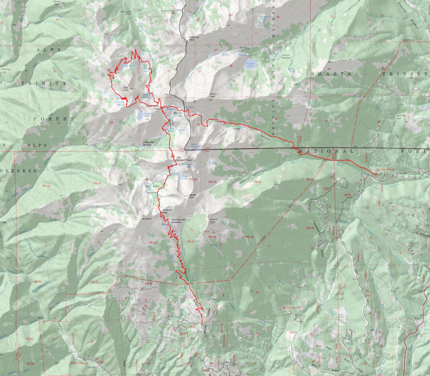 This trip report covers a 3-day outing with a group of friends to visit the scenic Four Lakes Loop in the Trinity Alps over Memorial Day, 2018. The low-snow year of 2018 combined with the area’s relatively low elevation made this a feasible early season trip. We had to bring two cars to fit our entire group, so we planned to enter and exit via different trailheads for a bit more variety and to lessen the big climb out of the gate.