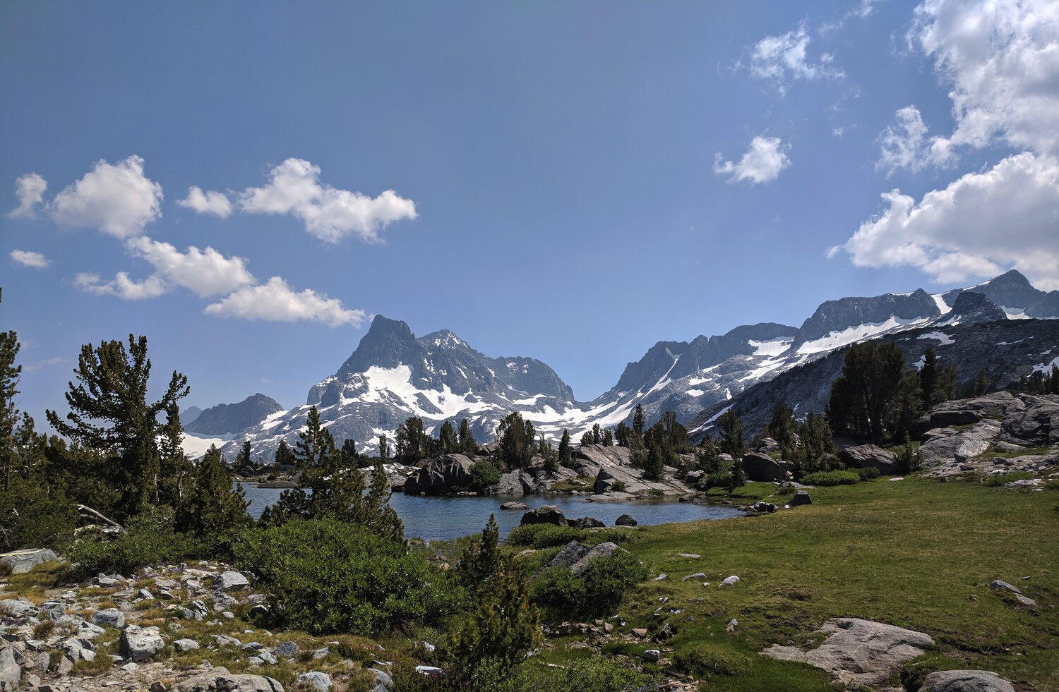 When I cleared Island Pass (10,205’) I got my first views of Banner Peak and Mount Ritter. The smoke was blowing more or less east of the fire now, so the sky cleared up a bit.