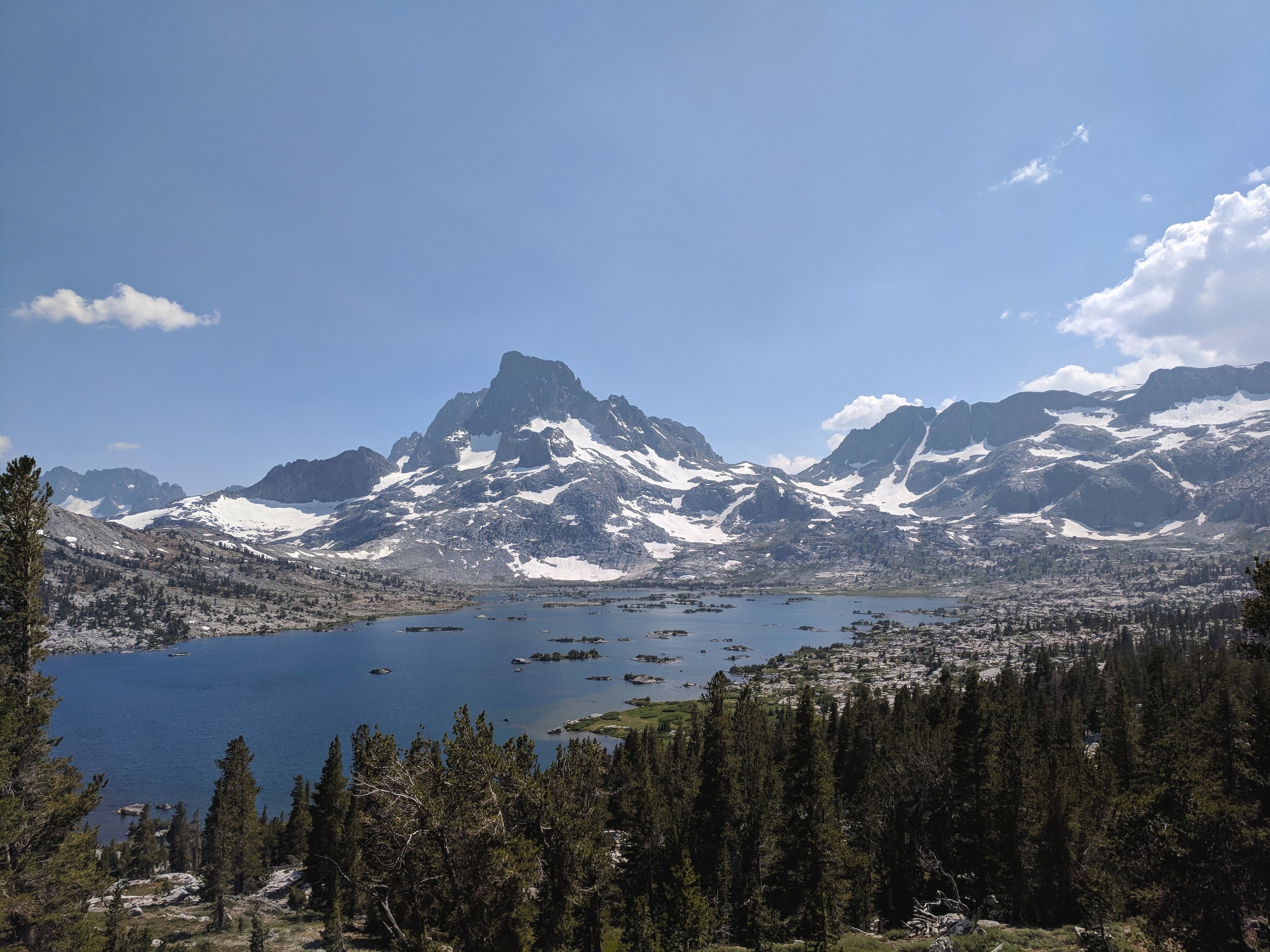 Overlooking one of the classic JMT vistas, Thousand Island Lake with Banner Peak in the background.