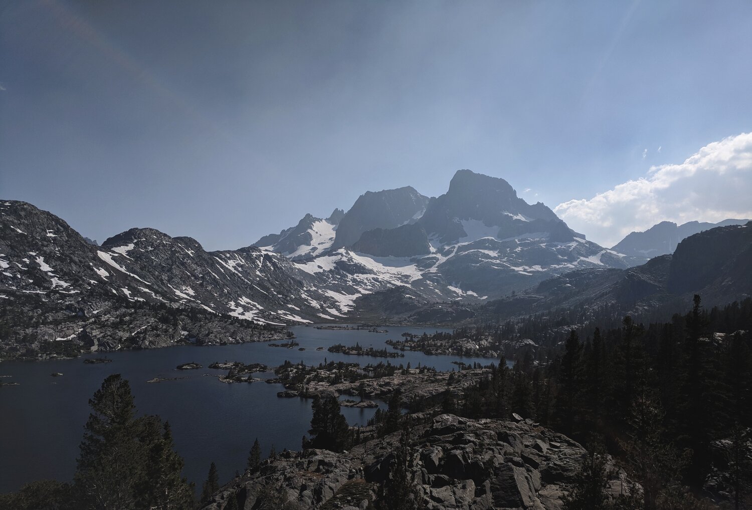 I got a bit of a late start on my first day. I hung around Mammoth to say bye to some friends who I had crashed with the night before and then had to drive up to June Lake. I think I hit the trail around 10. The nearby Lions Fire was blowing smoke into both Mammoth and June Lake that morning. There was a slight taste of smoke in the air, and fairly reduced visibility, it was also hot, my pack was fairly heavy, and my route started with a 3,000’ climb from Silver Lake to Island Pass. All of those factors combined to make for a tough first day on the trail.