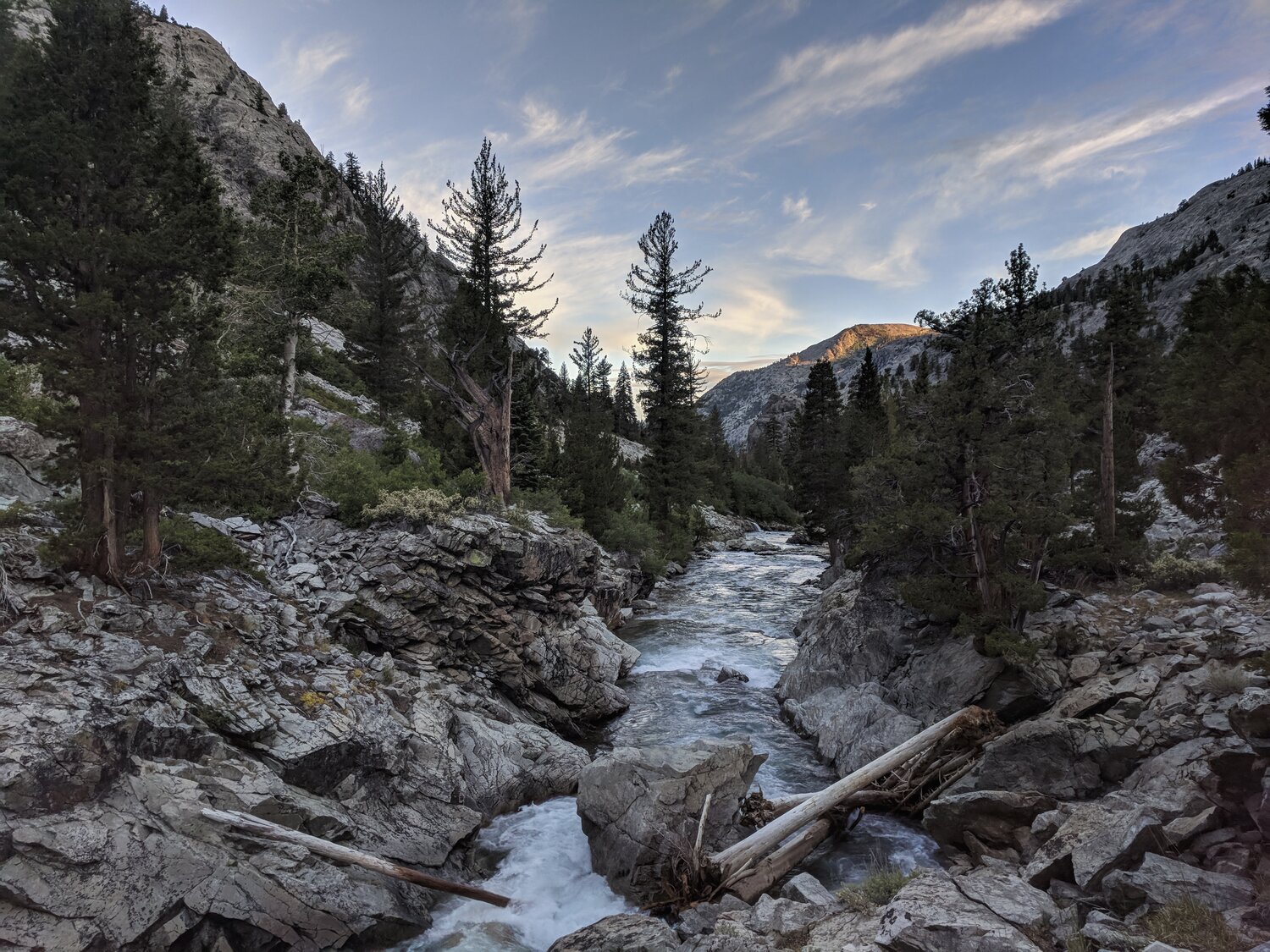 The Golden Staircase is a somewhat infamous section of the trail just below Palisade Lakes where the trail climbs over 1,500’ in a bit under 3 miles. The trail is mostly stone stairs here, and passes through a few narrow gaps in the rock with very tight switchbacks. Many find this to be one of the tougher sections of trail. After hiking over 32 miles, it was pretty brutal. But there aren’t any places to camp along this section, so my options were to descend back to the river valley and deal with the mosquitoes and climb this section tomorrow, or to push on to Palisade Lakes. I opted for the latter, making it to the lakes just before sunset. Here’s a view looking back down the Palisade Creek Canyon during the peak of the golden hour.