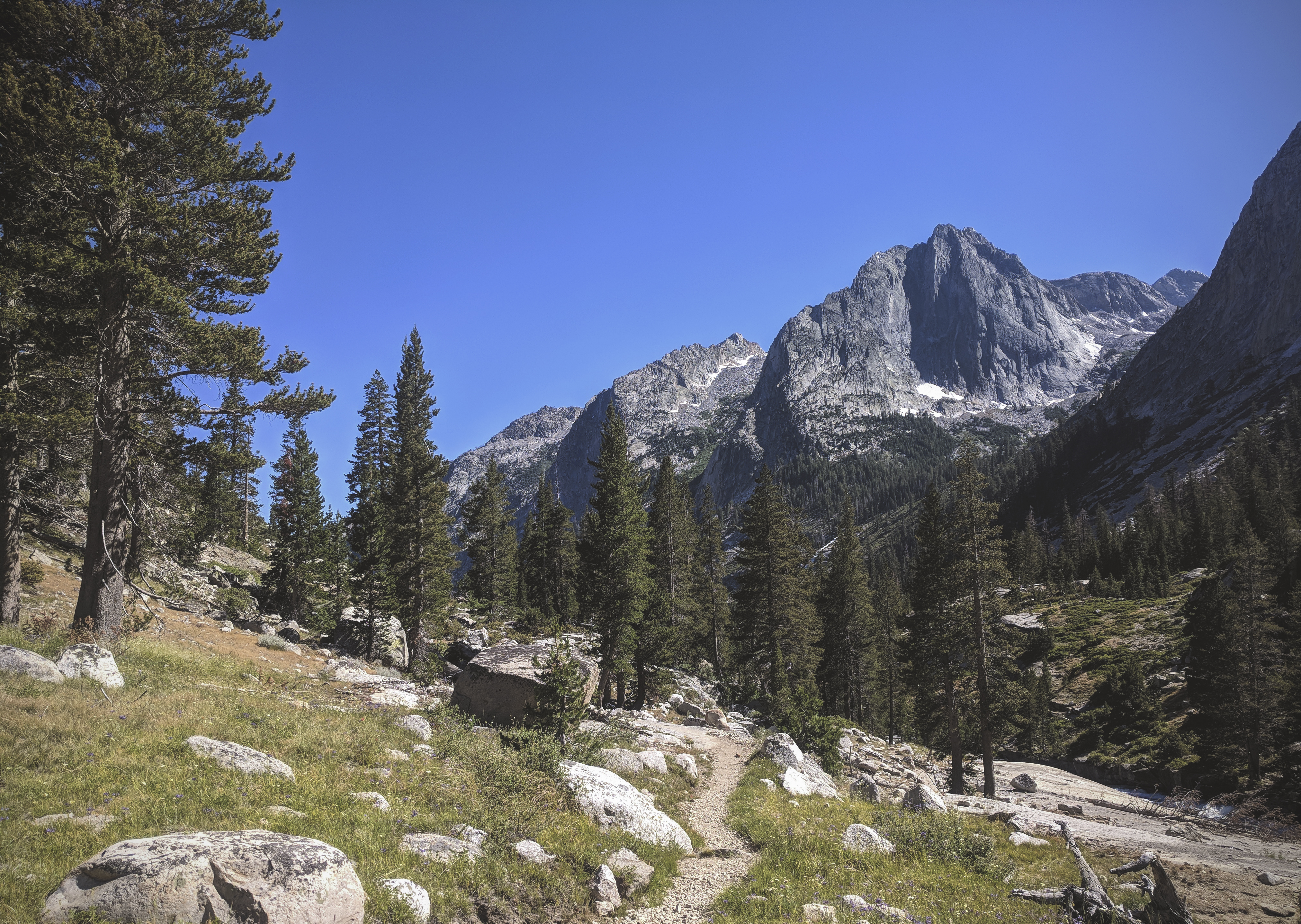 As the trail dropped deeper and deeper into LeConte Canyon, the surrounding peaks seemed to rise higher and higher. The peaks to the west had particularly dramatic faces dropping thousands of feet down to the valley.