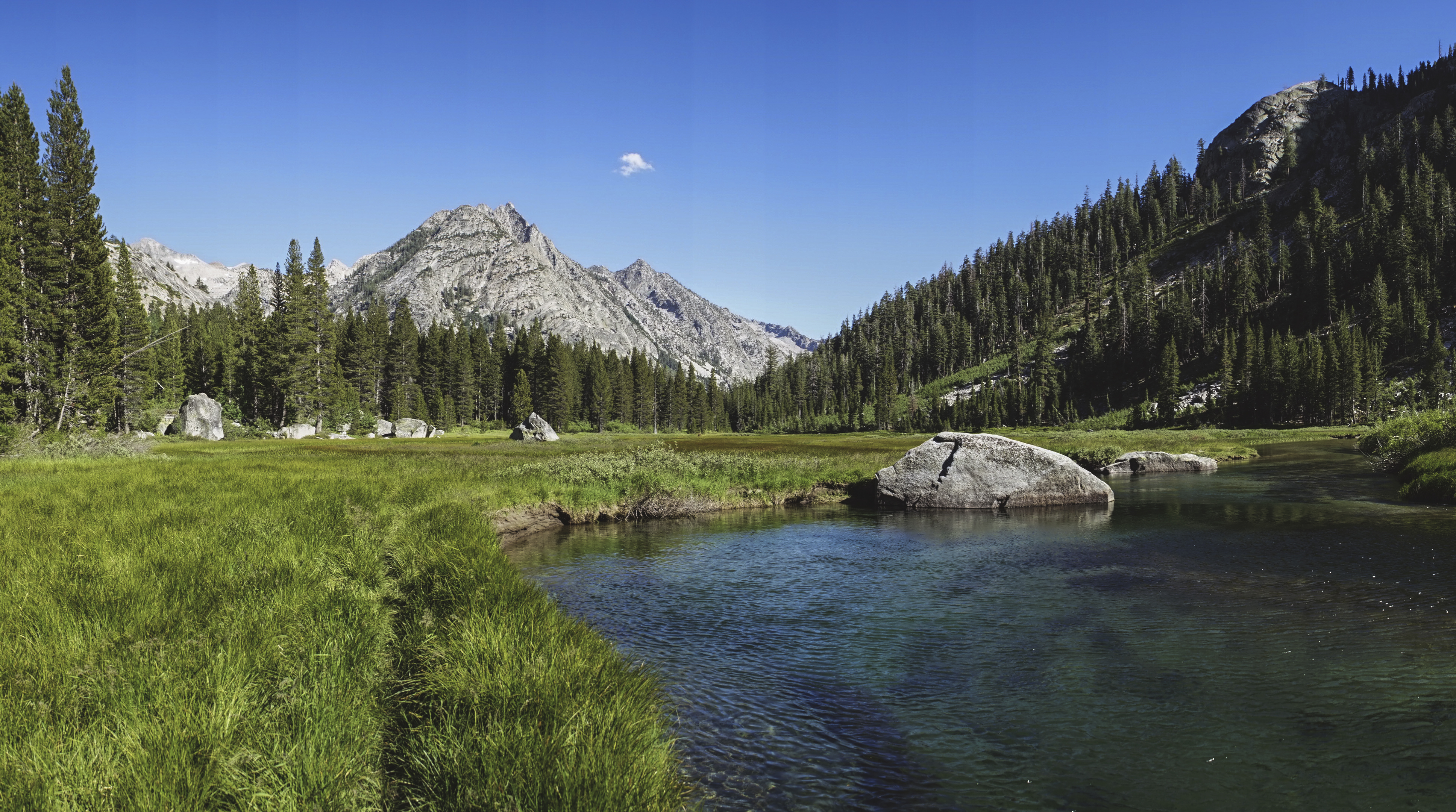 The view just out the front door of the McClure Meadow Ranger Station. Here, the Evolution River winds lazily through a meadow in a valley of high peaks, with The Hermit and the path up to Muir Pass at the head of the valley.