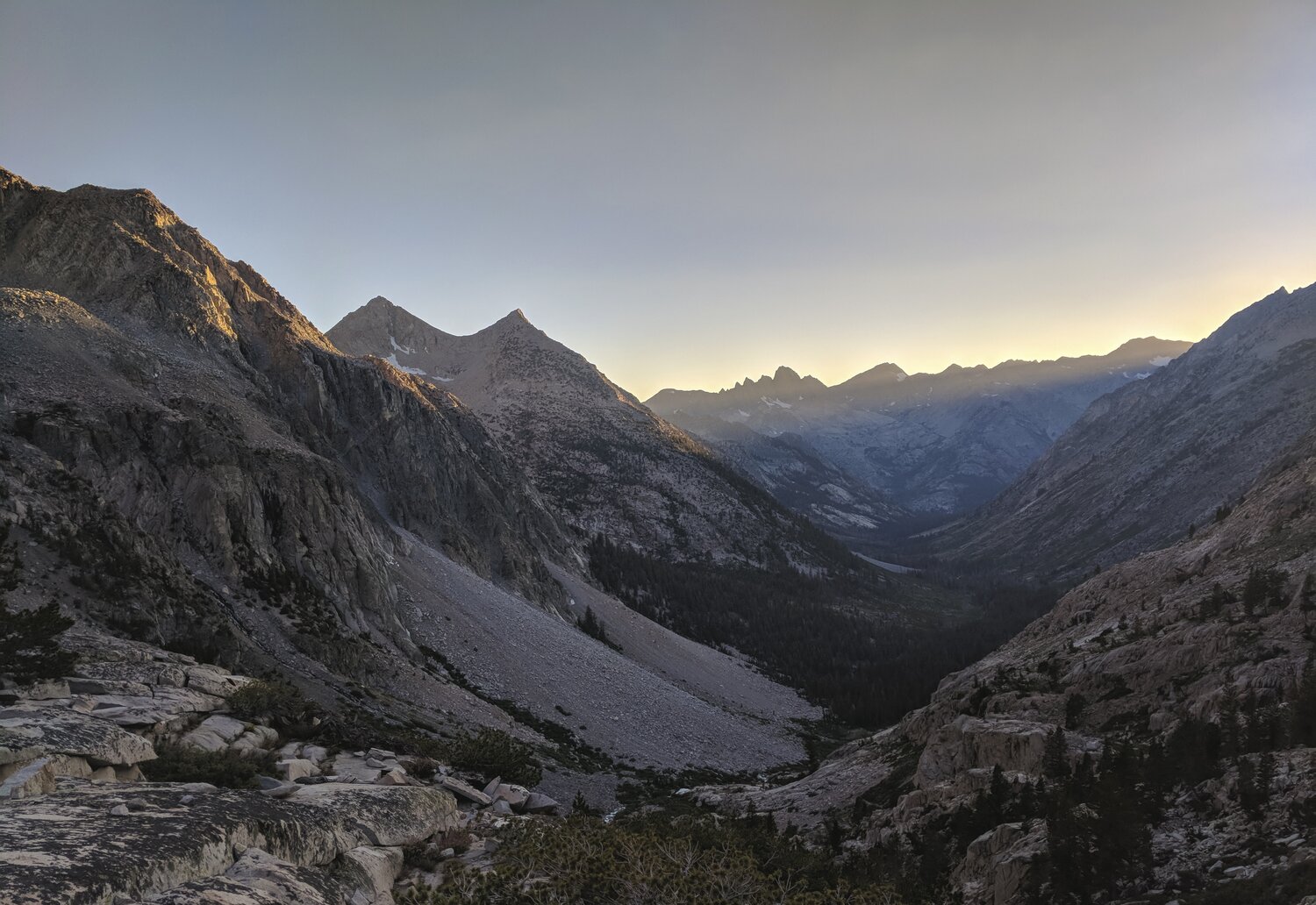 The view down to LeConte Canyon. Another drop from almost 12,000’ down to almost 8,000’ at the confluence of Palisade Creek and the Middle Fork of the Kings River.