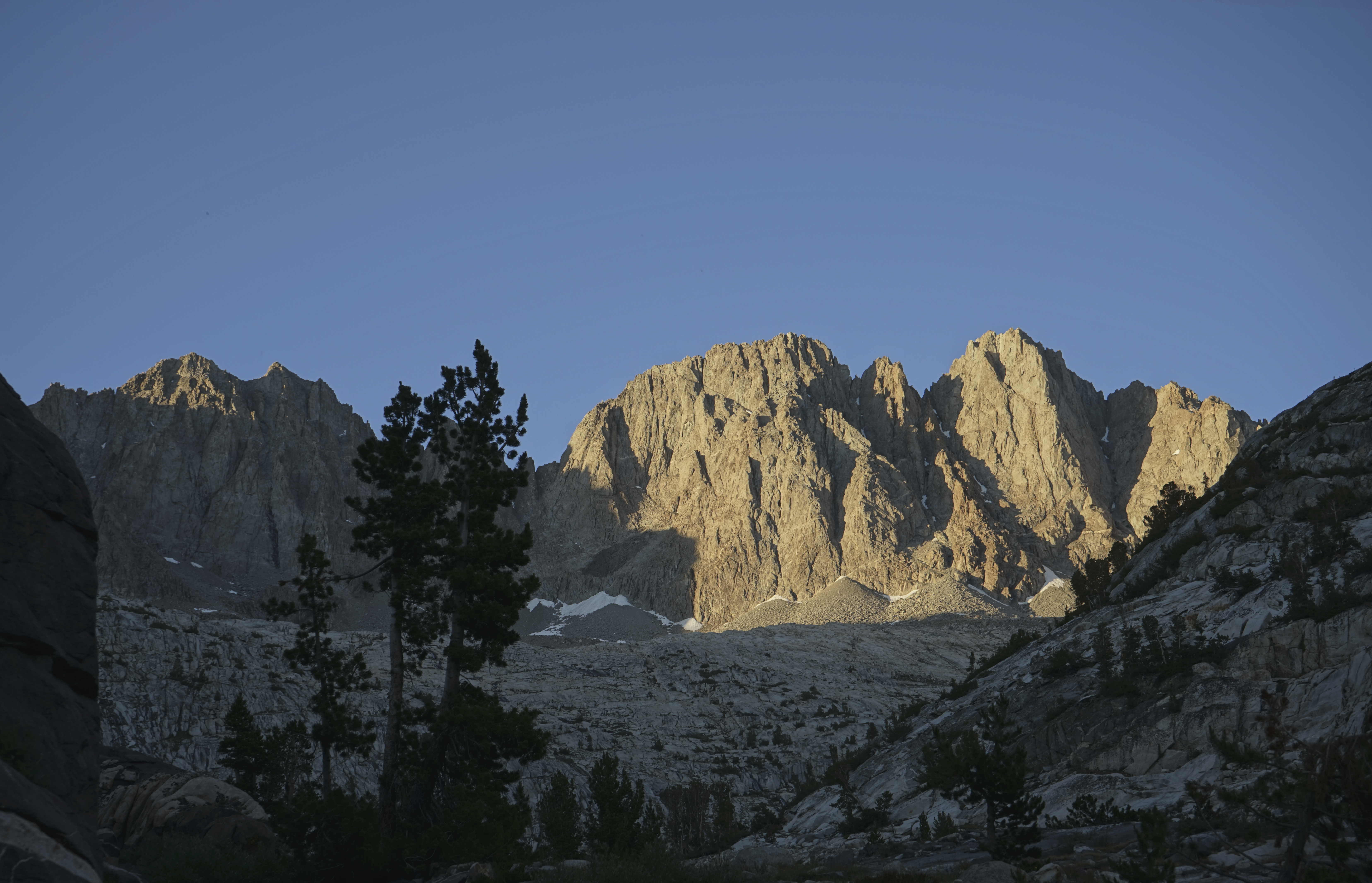 The Palisades are one of the highest sub-ranges of the Sierra, with six peaks higher than 14,000’. Here are Norman Clyde Peak, Middle Palisade, and Disappointment Peak bathed in evening alpenglow. Being able to catch sunset over my favourite sub-range of the Sierra was a real pick-me-up after a long day.