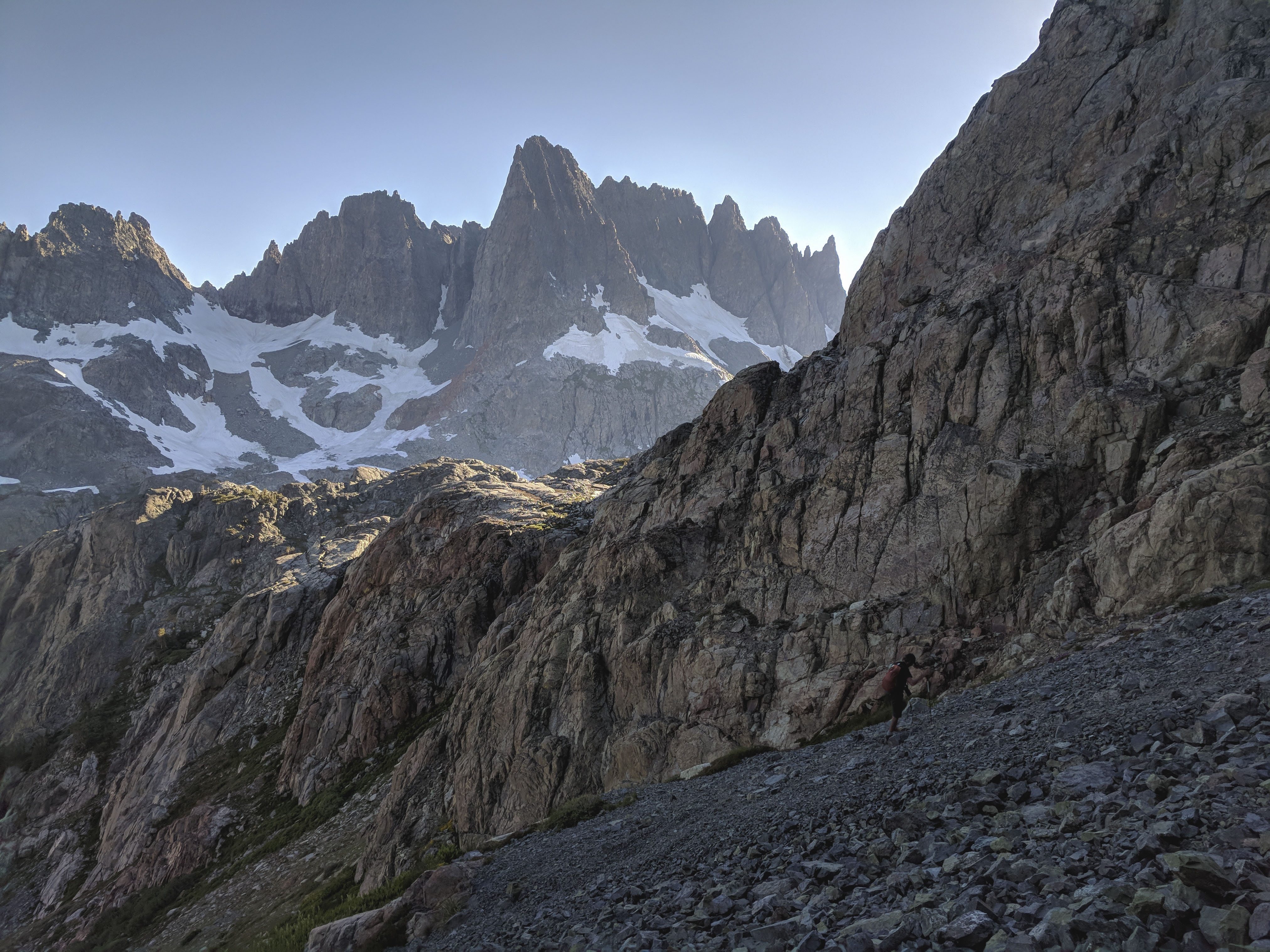 After resting for an hour or two, we headed out to climb the Volcanic Ridge, a small peak near the Minarets that divides the Ediza Creek and Minaret Creek drainages. I chose this climb because the view of the Minarets from the summit is supposed to be fantastic. We tried to time our summit with the start of the golden hour, just as the sun was setting behind the ridge to our west.