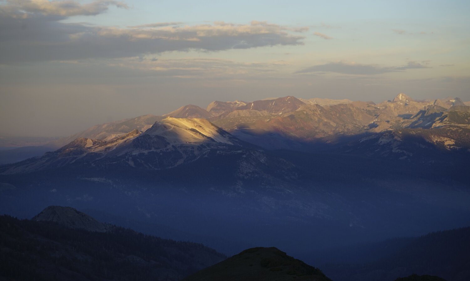 Just after the sun dropped below Mount Ritter (the high point just left of center) and Banner Peak (center). You can just see the west tip of Thousand Island Lake peaking out to the right.