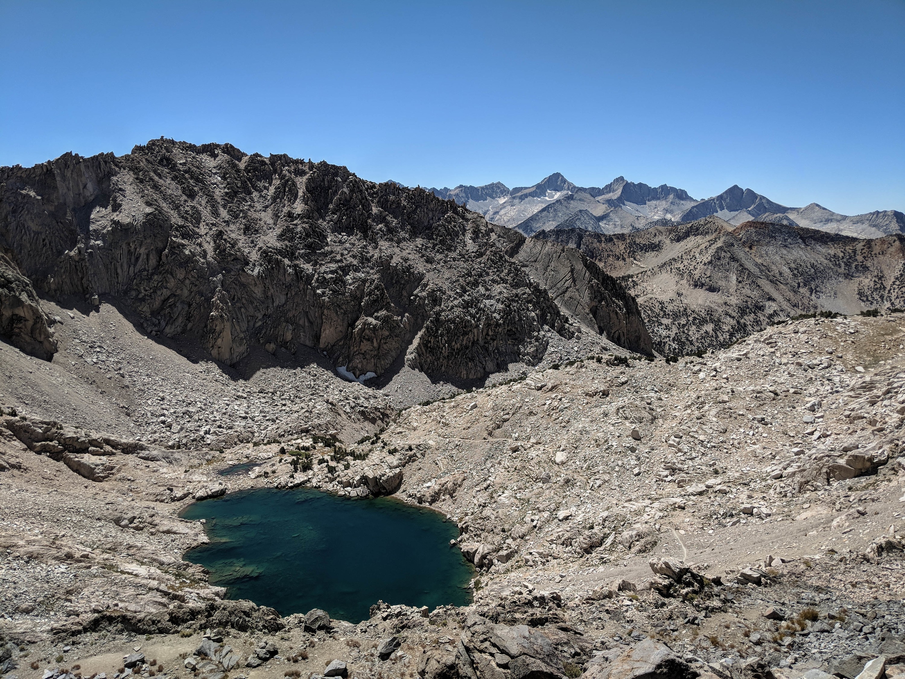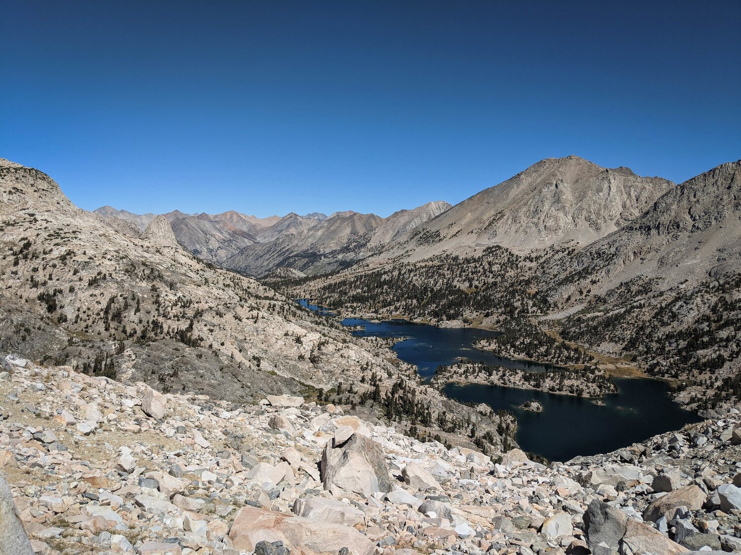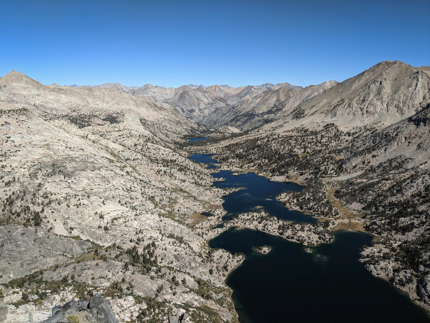 Looking back over Rae Lakes from the saddle below the Painted Lady.