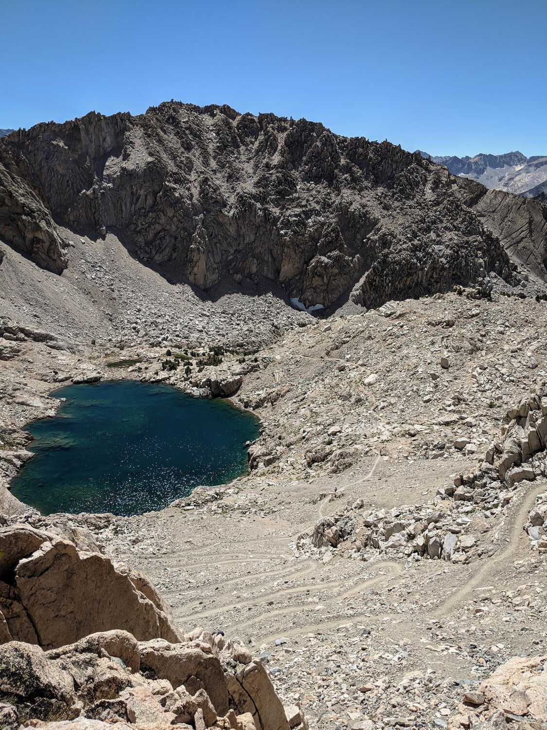 Looking down the switchbacks ascending the south side of Glen Pass. A train of NoBo JMTers passed us atop Glen Pass.