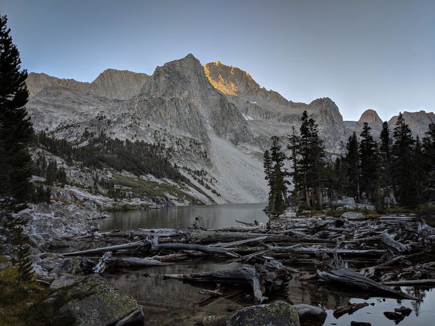 We debated between setting up our camp across the stream just northwest of the outlet, or on the peninsula on the east shore. We opted for the peninsula, mostly because we didn’t want to cross the relatively deep outlet stream twice. We found a sandy site among granite slabs on this peninsula and set up our cowboy camp. The other group, a trio with three tents, had set up at obvious sites a bit lower on the peninsula. We fell asleep for the fourth consecutive night sans tent, under the stars.