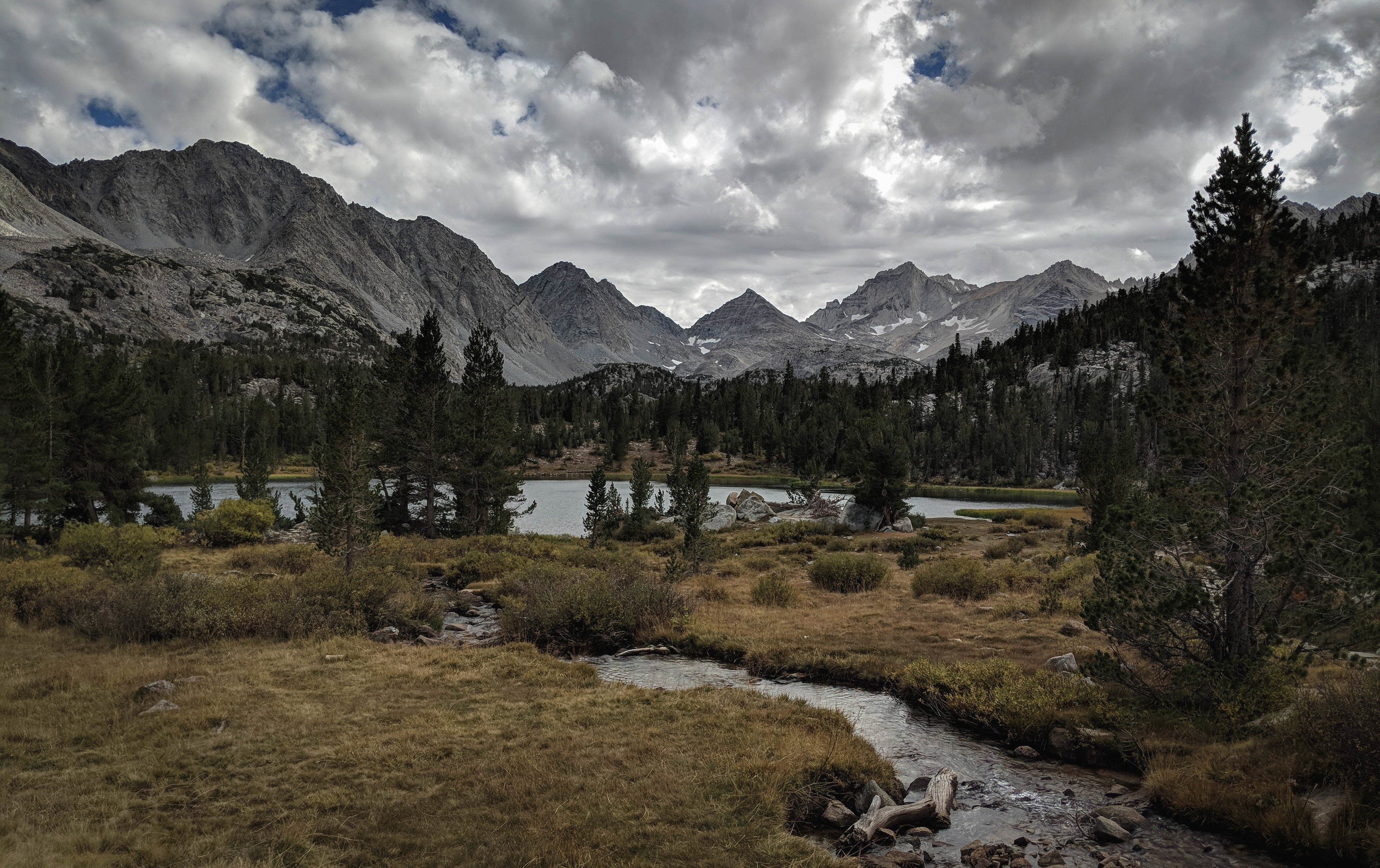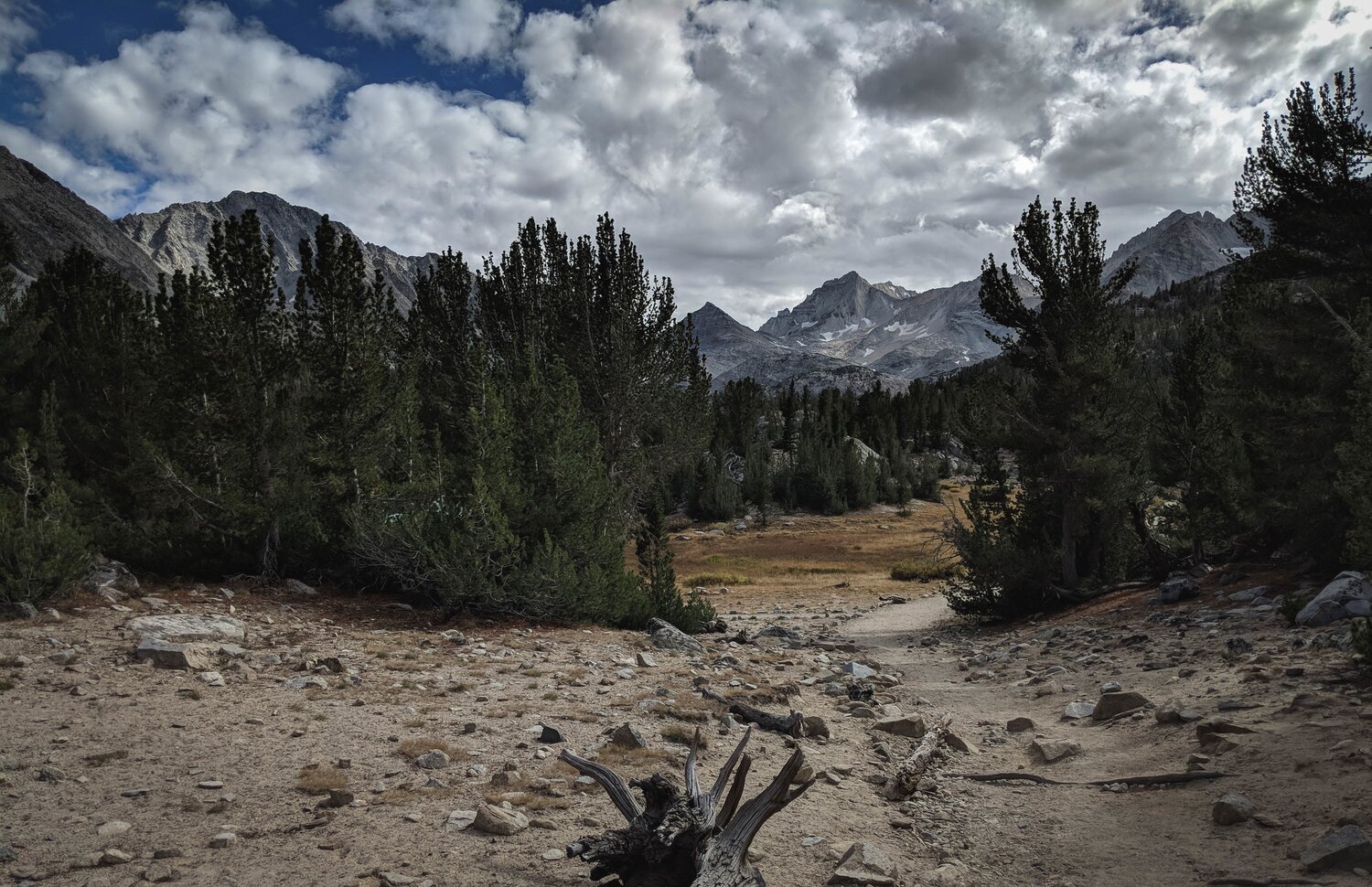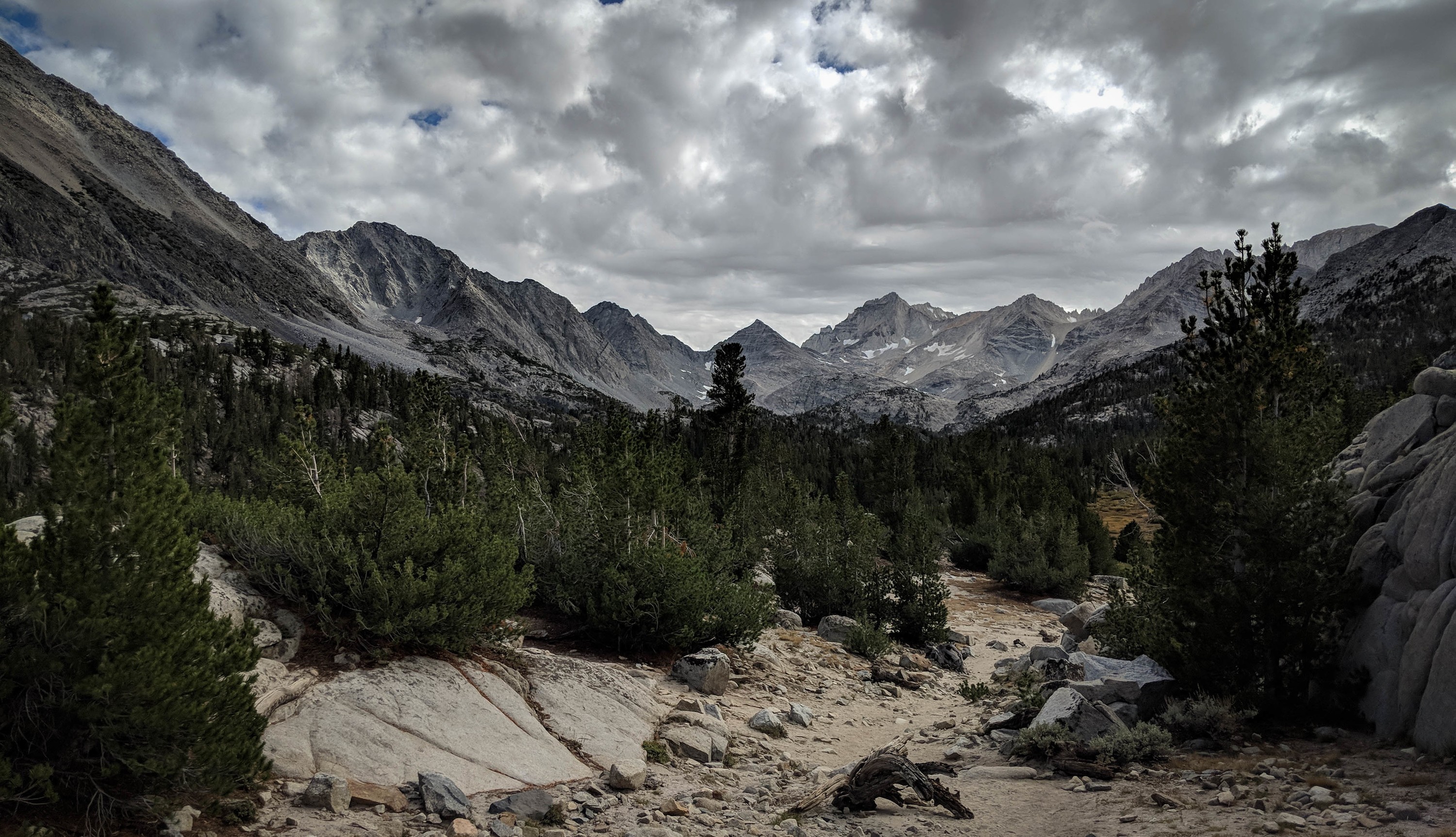 Bear Creek Spire standing tall at the end of the Little Lakes Valley. The weather had deteriorated again today, but we didn’t see any indication of thunderstorms.