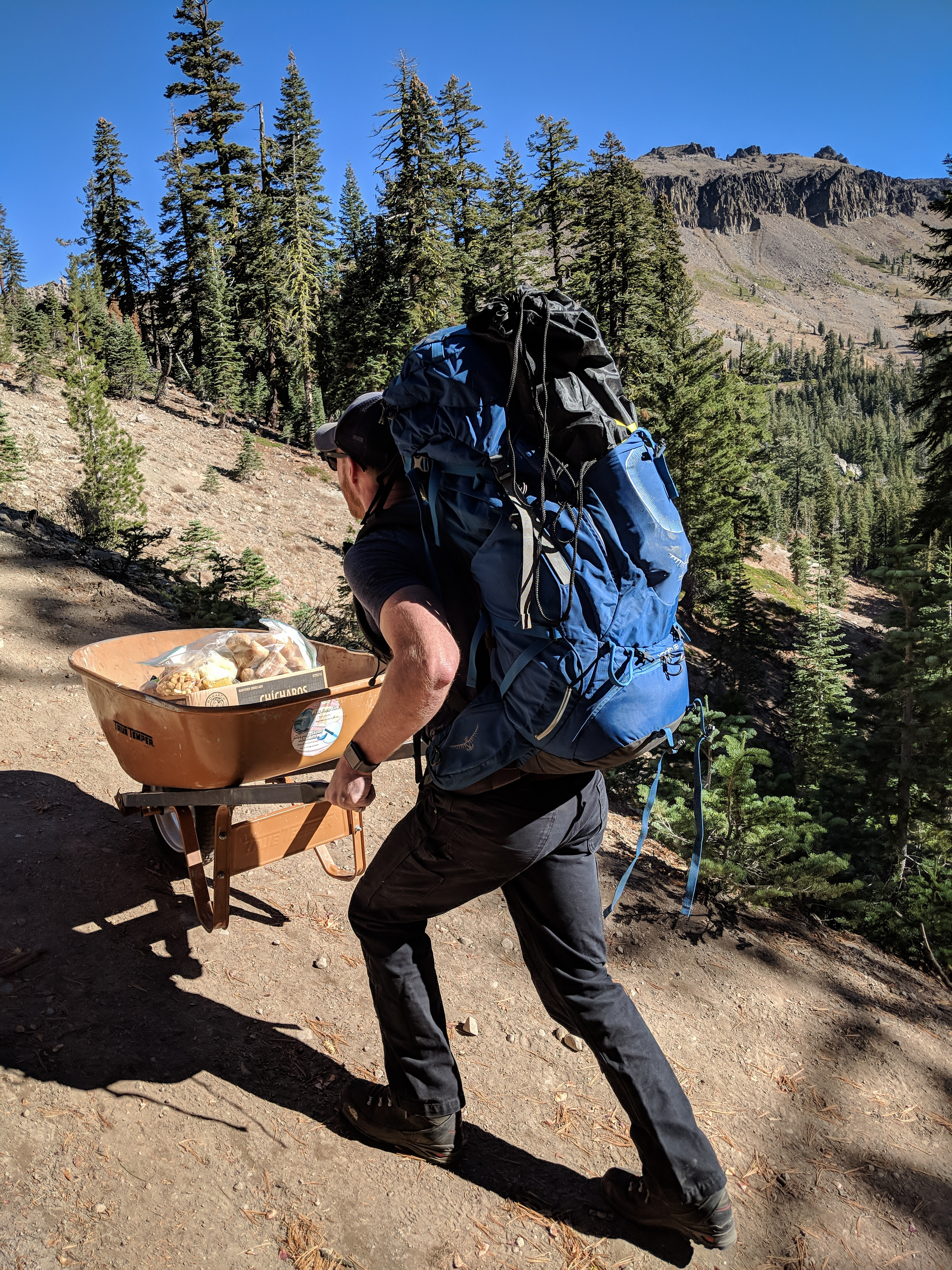 Derek pushing a wheelbarrow full of food up the short climb to Castle Pass. Castle Peak rises behind. You may be surprised to learn that the spikeball kit did not make it out of its bag this weekend.