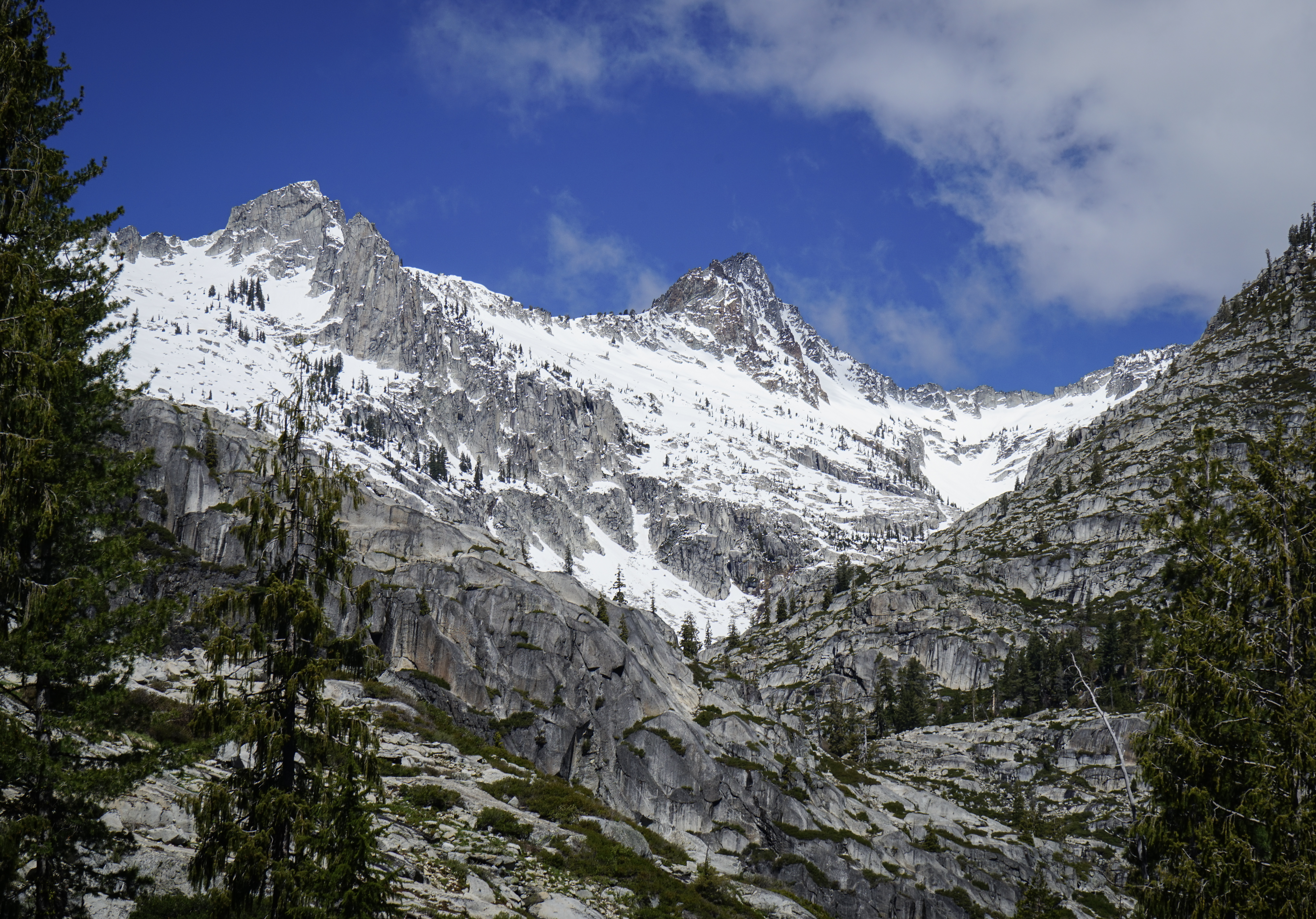 After a lovely walk through Upper Canyon Creek Meadow and then up a steeper section, snowy Wedding Cake and Thompson Peak appeared on the ridge high above.