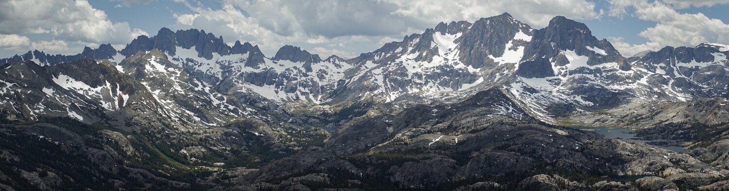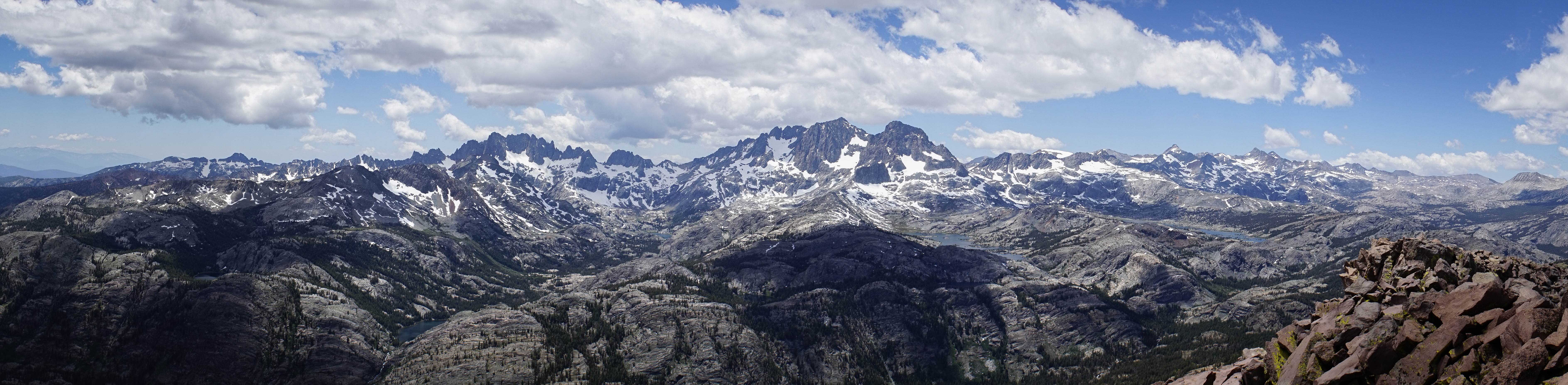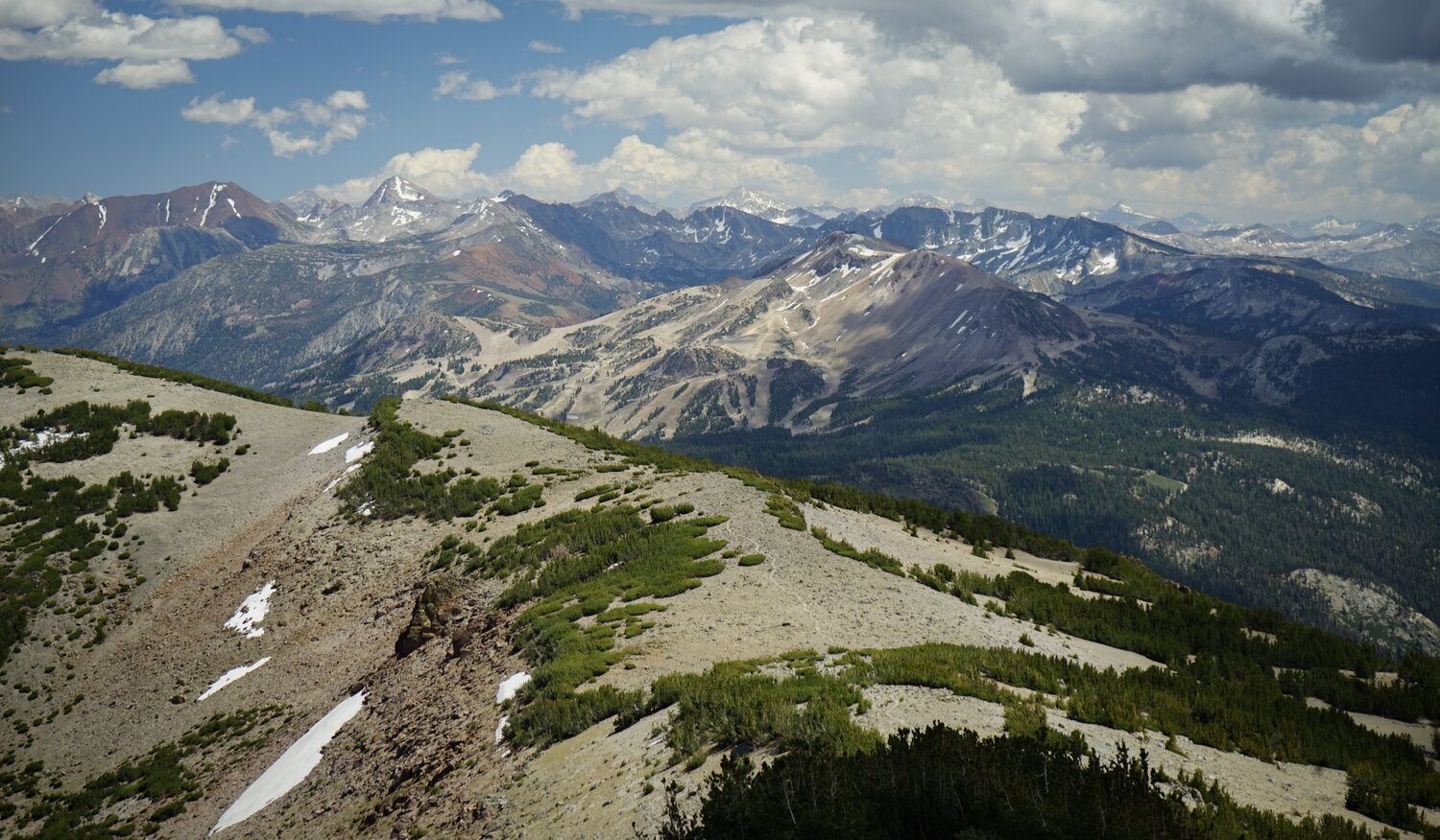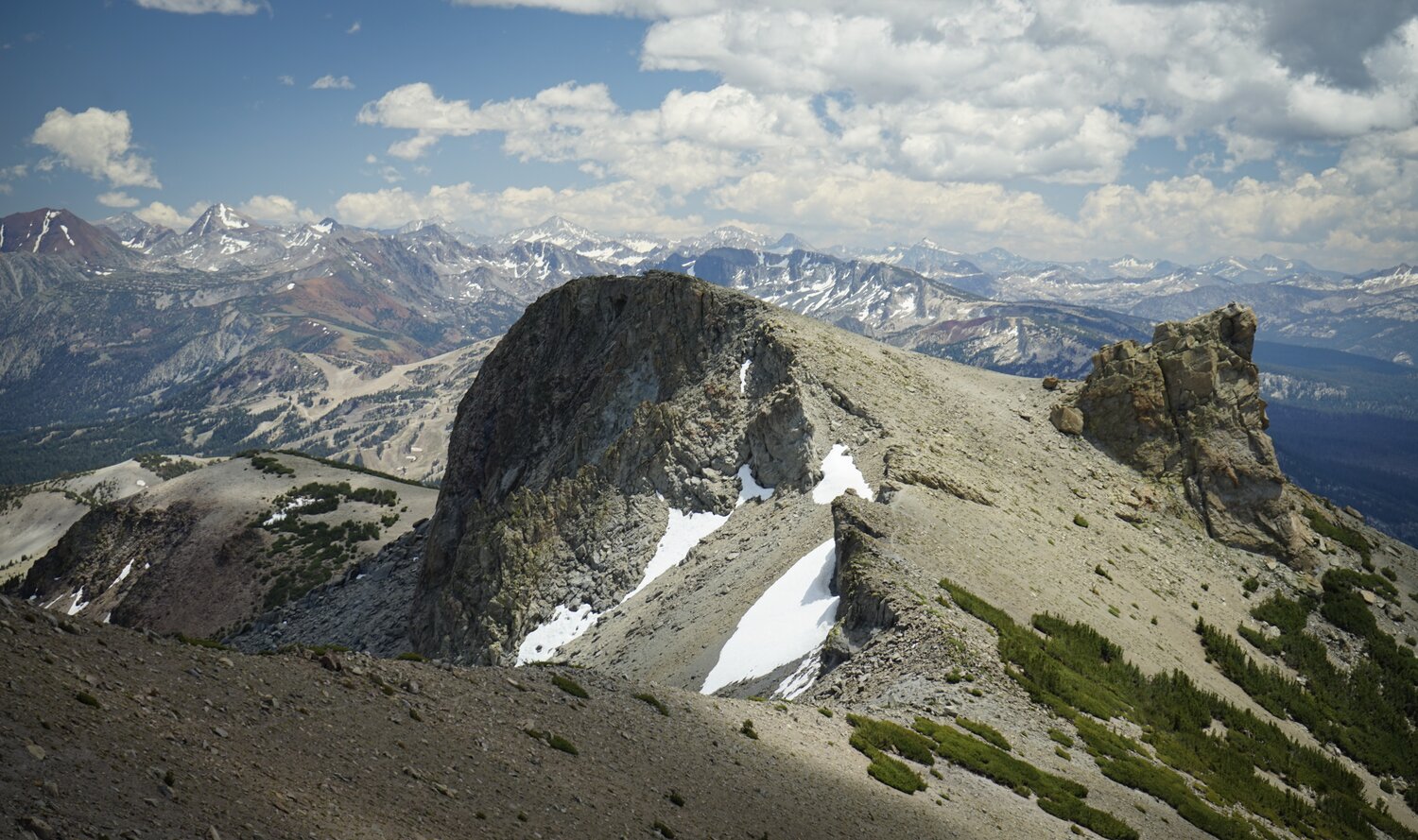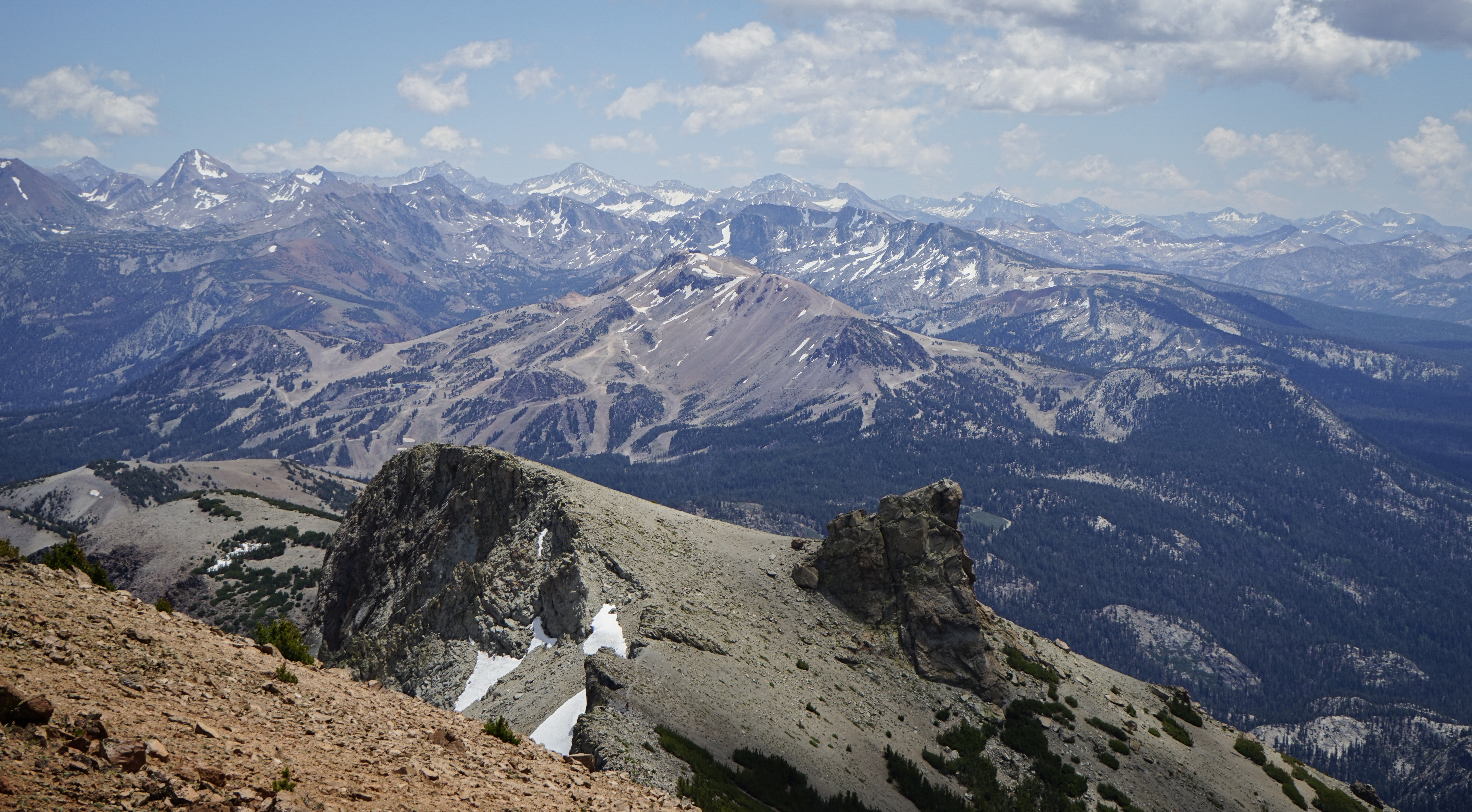 The view south from near the summit. The two small peaks in the foreground are Two Teats, beyond that, Mammoth Mountain is visible in front of the Silver Divide and Mono Recesses. Red Slate Peak is visible at left, with the slanting couloir, the snowy peak in the center is Mount Mills (I think), Mount Humphreys is the pointy, darker one to its left, and the two pointy mountains at center-right are Mount Hooper and Mount Senger on both sides of Selden Pass.