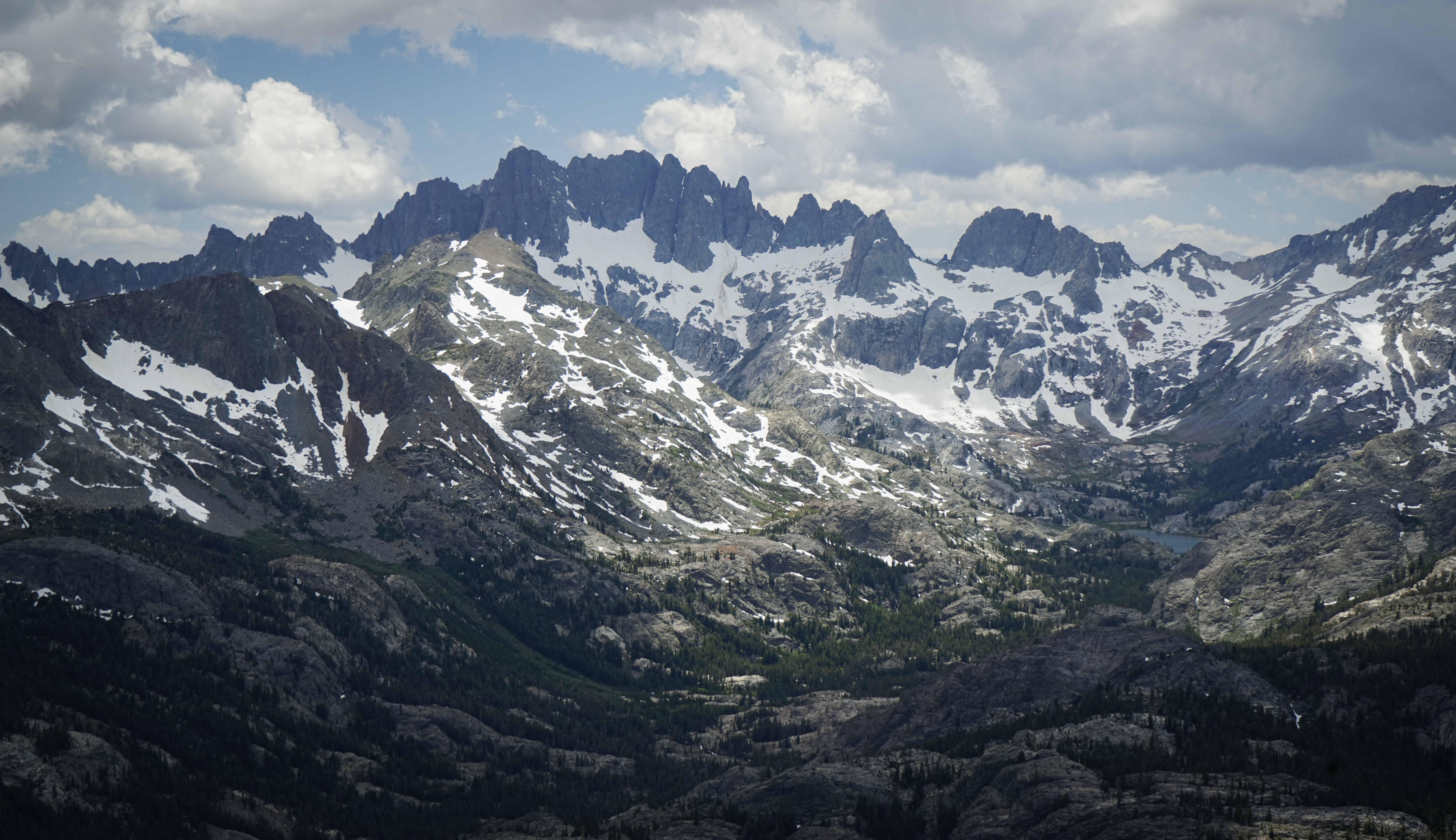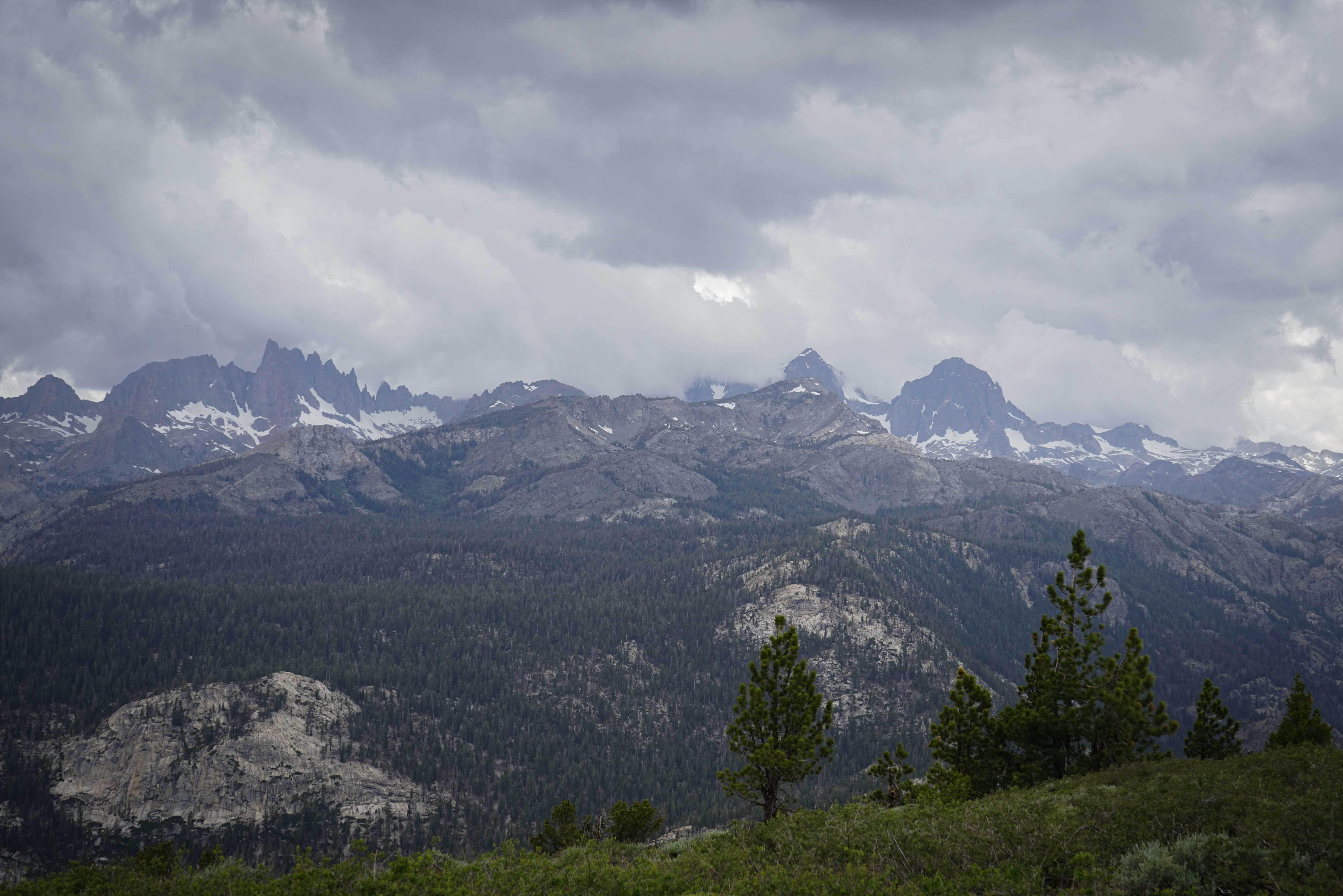 By the time I got back to Minaret Vista, around four o’clock, the clouds had built into a little afternoon storm. It settled over the Ritter Range, leaving me in occasional sunshine. I didn’t hear any thunder, but it definitely looked like it was at least raining a bit over on the JMT.