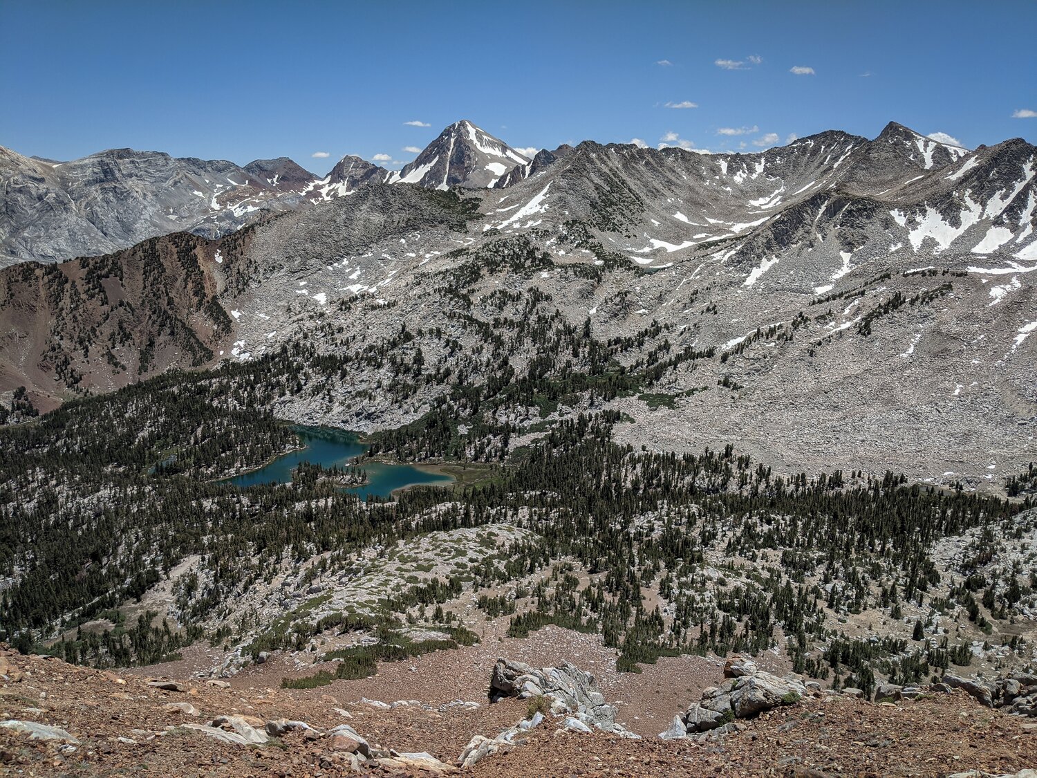 Lake Genevieve and the high peaks around it as I started the wraparound climb to the saddle between Bloody Mountain and Laurel Mountain.