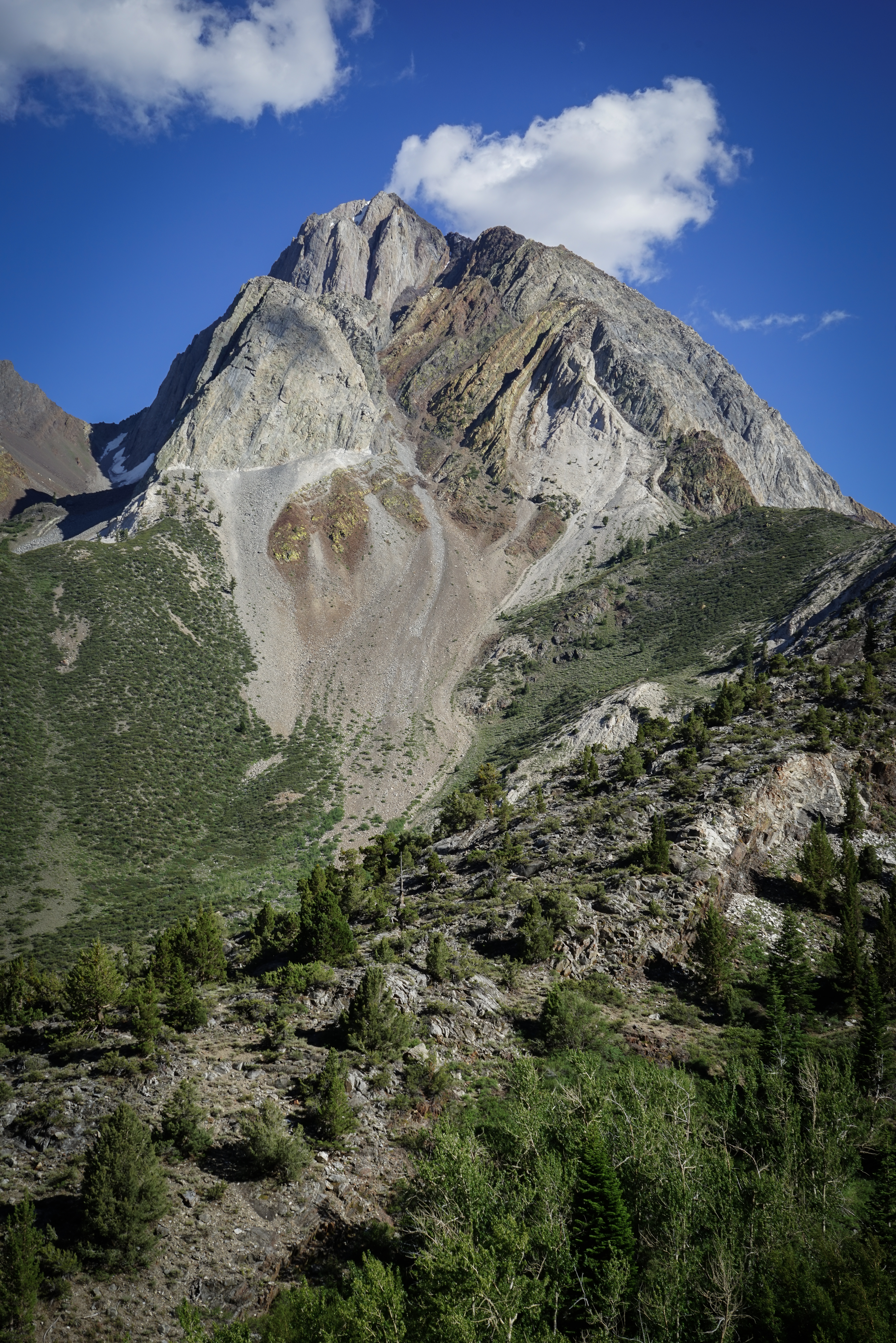 As I descended, some small clouds came in and made some nice light conditions. Here’s Mount Baldwin, Red Slate Peak, and the valley through which Convict Creek runs from above.