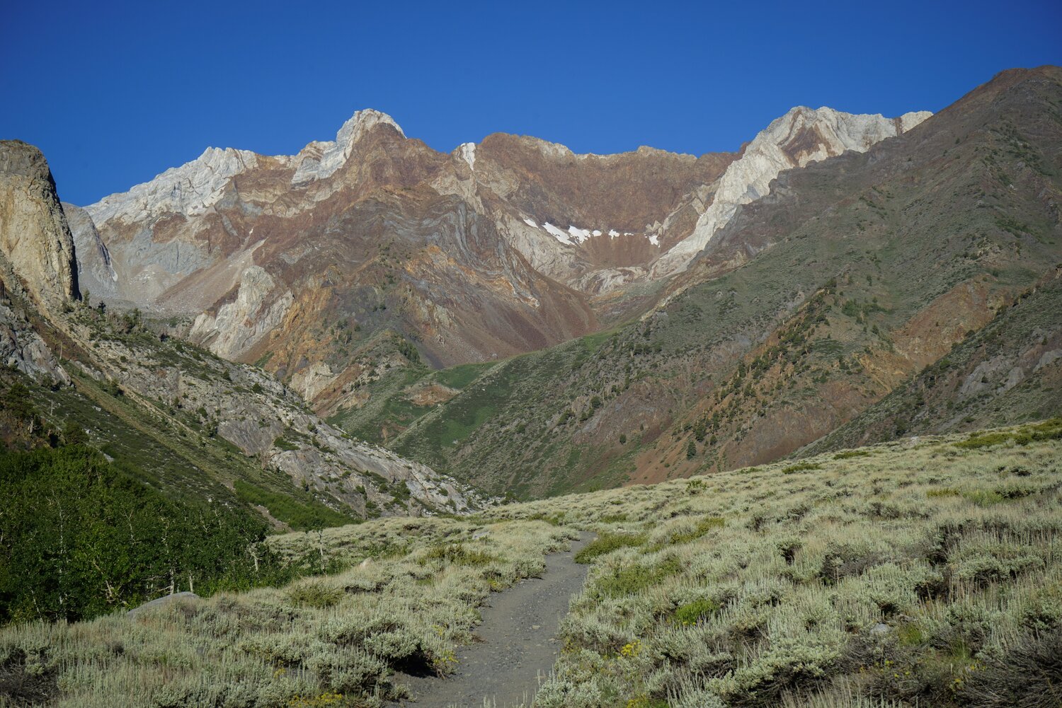 Another thousand feet of easy climbing following an occasional use trail and I was at the summit, with a great view to the south. McGee Pass and the trail are quite easily visible, as are the Mono Recesses behind Red and White Mountain, which still held a large snowfield.
