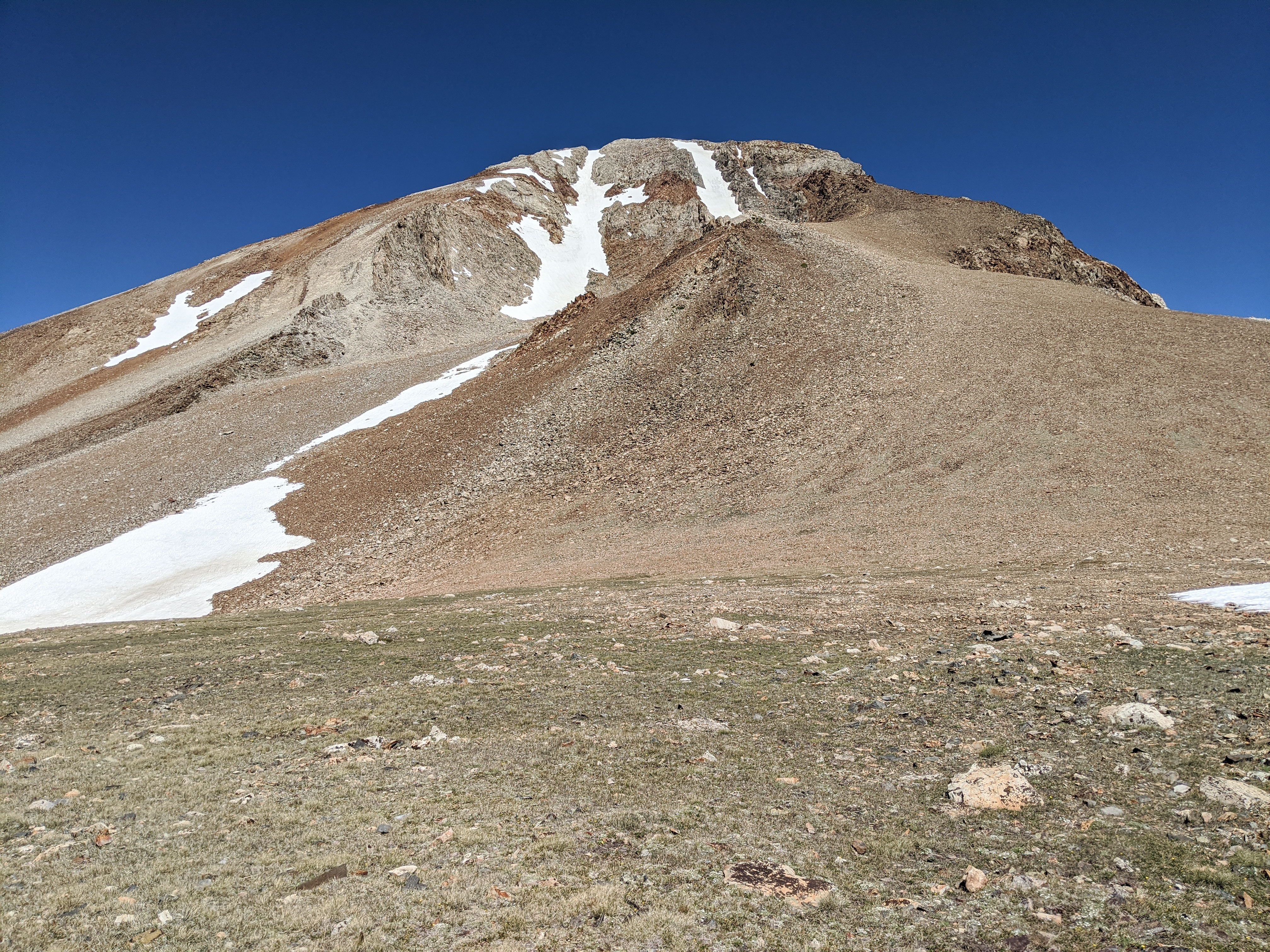 There were a few groups of hikers coming and going from McGee Pass, including a family of 3 (dad and sons) who arrived at the pass from the other way at about the same time I did. Dad was quite excited and wanted to relay stories of all the fish they caught at Tully Lake and how awful the mosquitoes were (he was from Minnesota, so he should know he told me). His panting and apparent lack of interest in social distancing made me less interested in hearing these stories, so I headed up towards the peak over easy tundra and broken rocks.