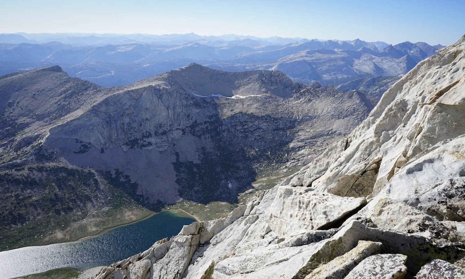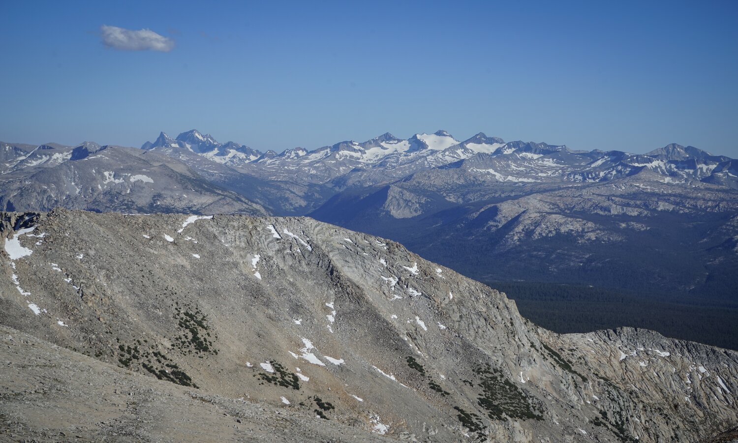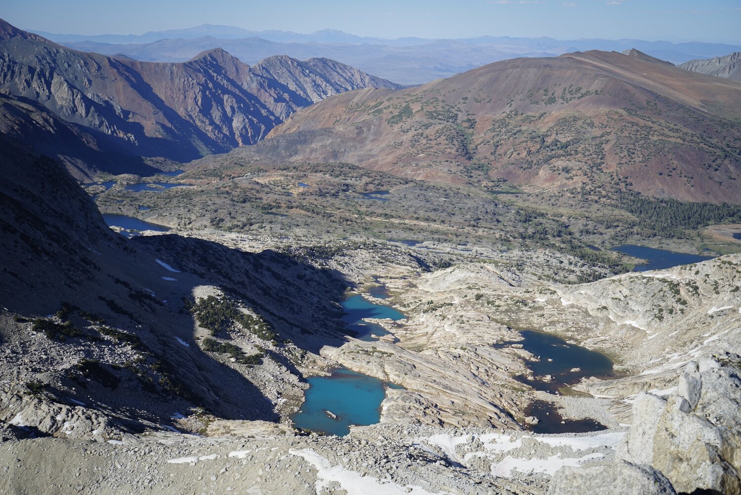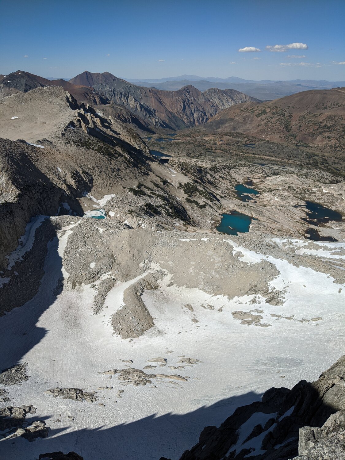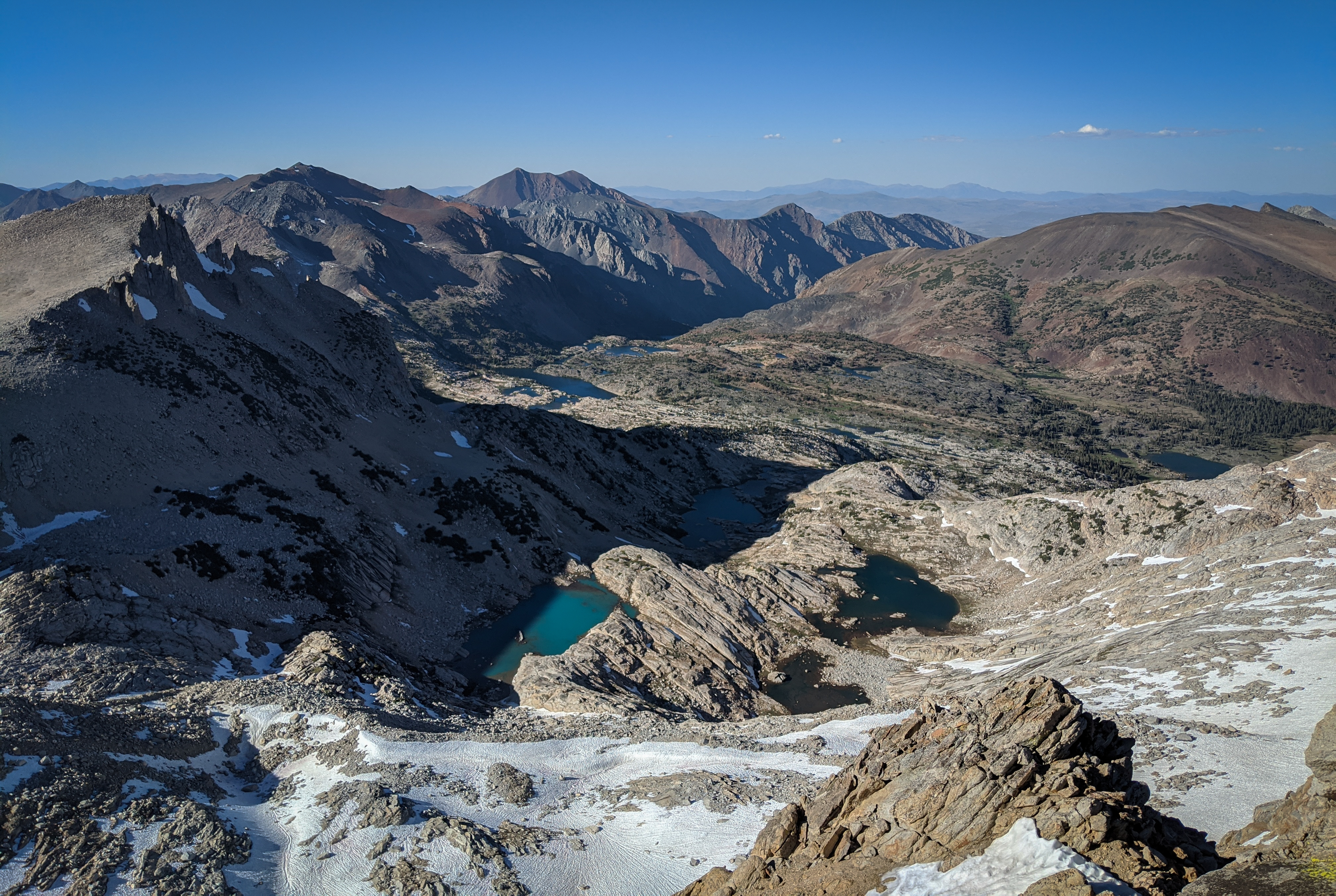 View north over the Conness Glacier, Conness Lakes, and all the way down to Lundy Canyon.