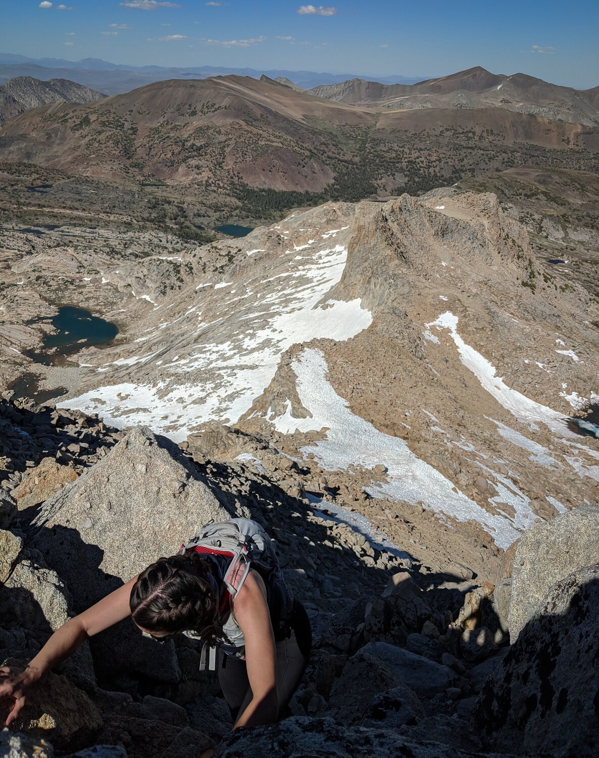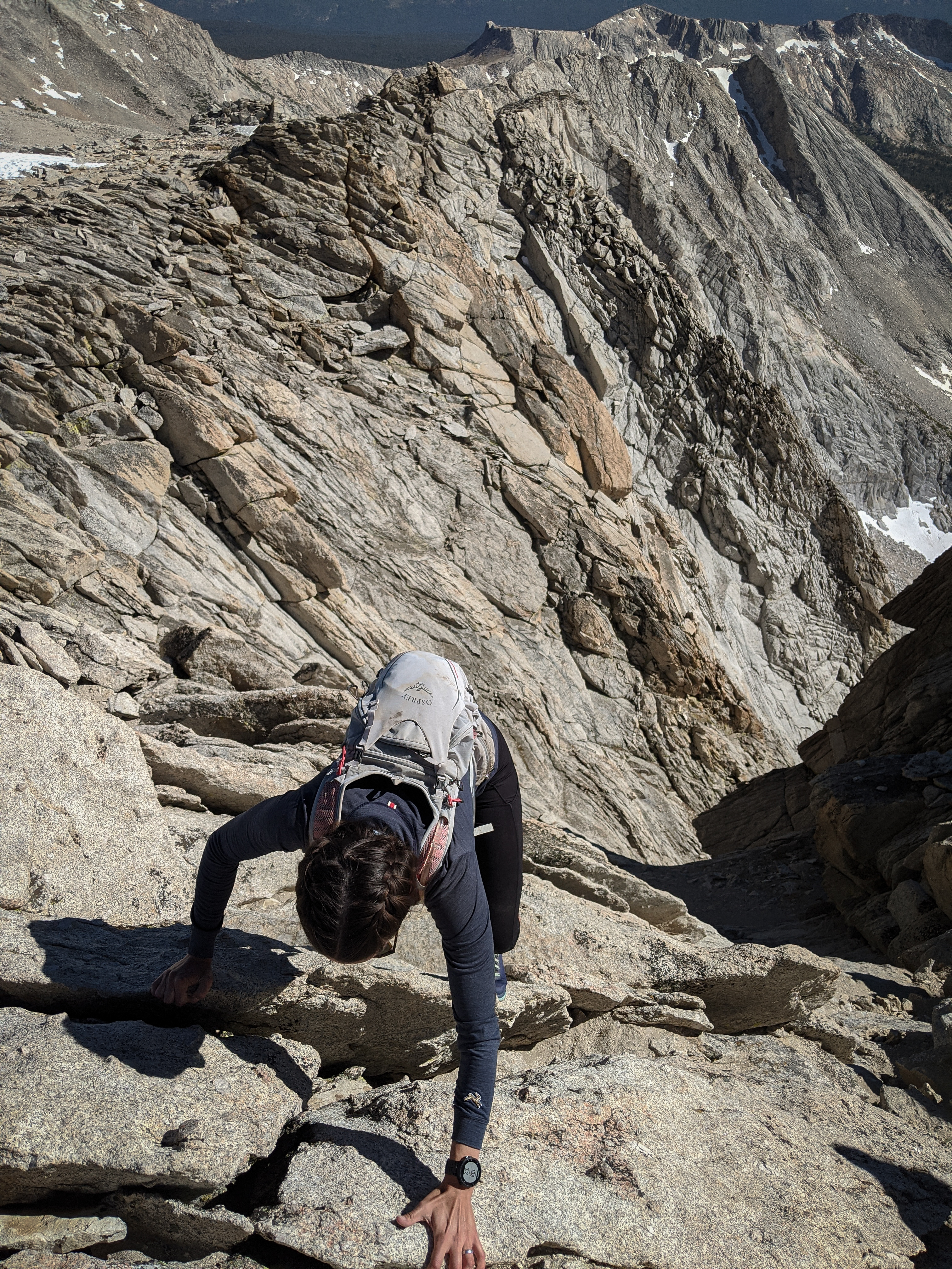 View of the West Ridge (and Mount Warren!) from the notch where we climbed some class 3 rocks to gain the summit plateau.