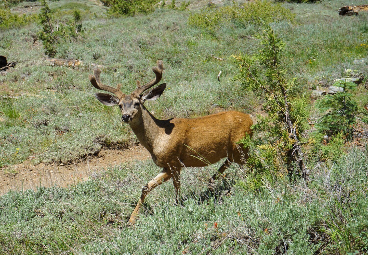 We got to the trailhead around 12:30 and found the main parking lot for the Franklin Pass Trail full, so we laid out our tarp in a parking spot we found on the side of the road and pulled the car in. Then, we wrapped it up from above with a bunch of rope. There are marmots in this area that have developed a certain taste for the more flavorful parts of a car’s interior – hoses and belts and things, and on occasion they’ll get into the hood of someone’s car and disable it. So, the rangers here recommend you wrap the underside of your car with a tarp to keep the determined rodents out.