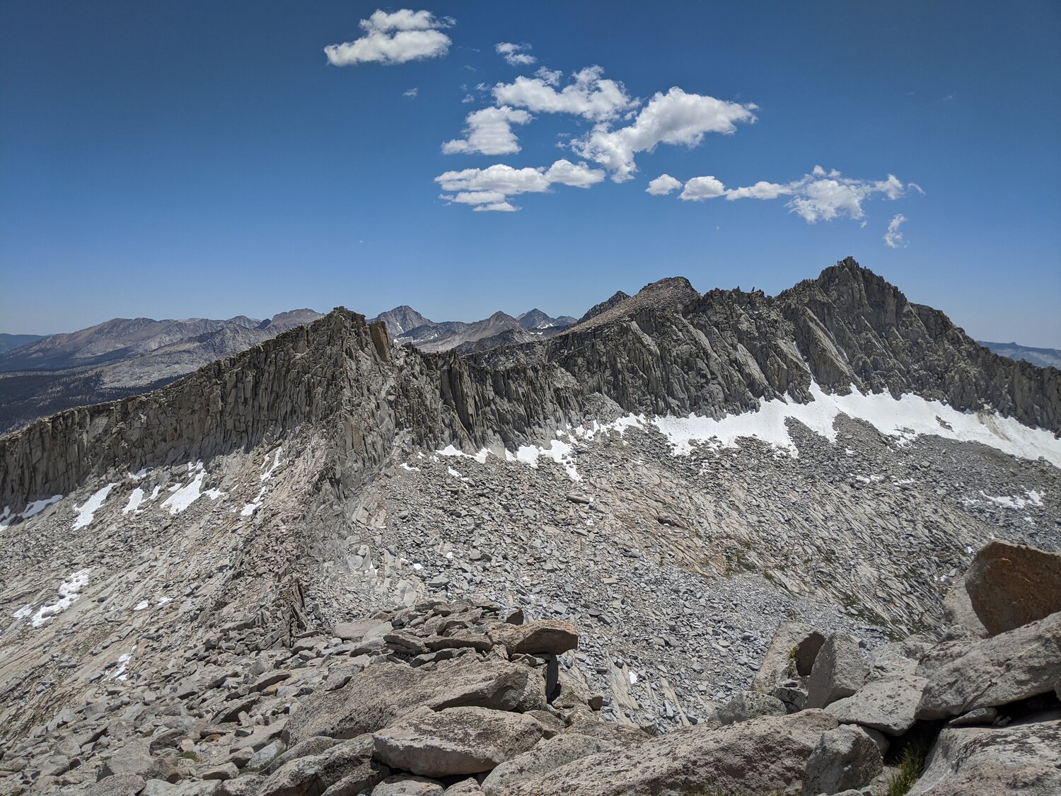 I hiked back across Kaweah Gap, dropped down the east side a bit and then left the trail and traversed talus and grassy slopes to the east slope of Eagle Scout Peak. Then I started climbing up over talus into the bowl east of the peak. After a while I realized I was accidentally heading up the small peak. Directly south of Eagle Scout Peak is another, very similar looking mountain, though the southern peak is a bit different. I checked Gaia and corrected course, veering northwest towards Eagle Scout Peak. I was on the summit at 1:15.