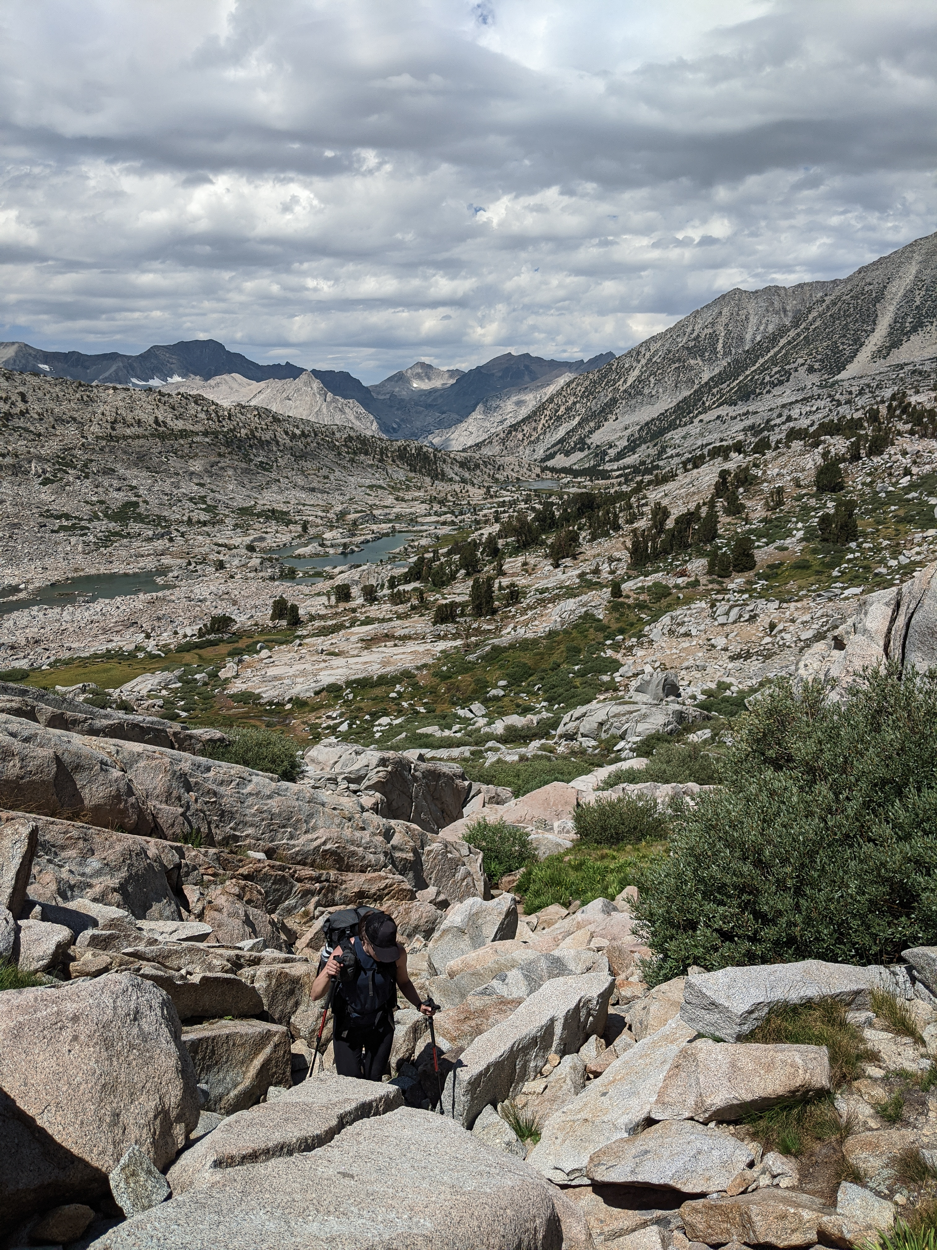Bishop and Saddlerock Lakes, and even Mount Humphreys, from Bishop Pass. The hike to the pass went by without incident. We saw groups heading up and down. The afternoon thunderstorms the previous day gave some people a bit of excitement.