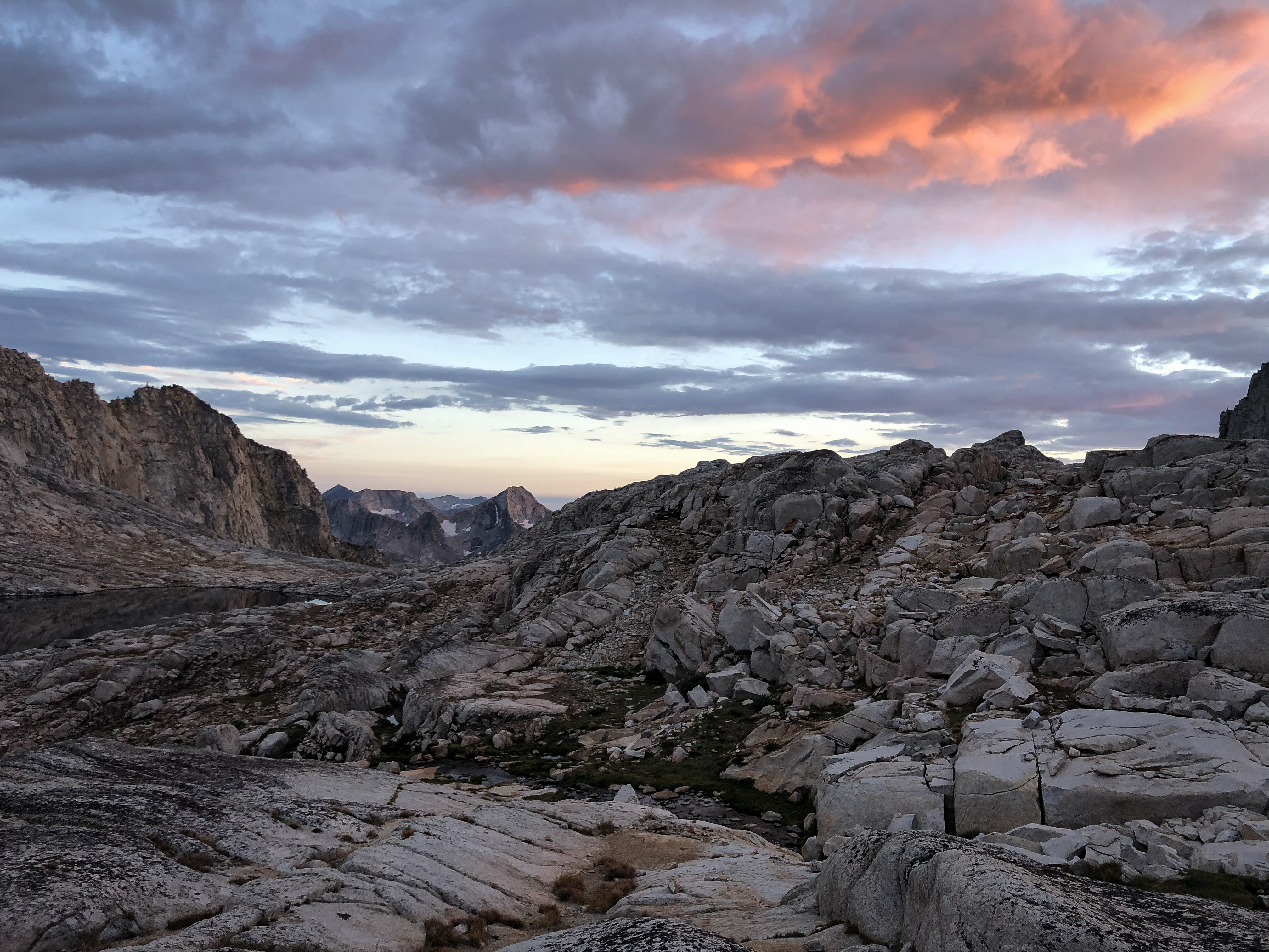 We made it down to the larger Glacier Creek Lake and made camp north of the lake on some slabs. We spent a couple of hours hiding from the rain as it passed through a few times before enjoying a lovely sunset.